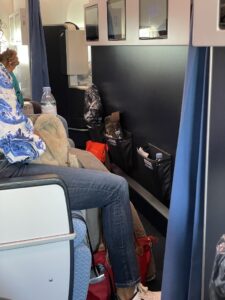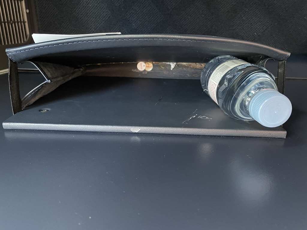 Auf den Sitzen lagen Kissen und eingeschweißte Decken. Kleine Wasserflaschen am Platz gehörten ebenfalls zur Grundausstattung. Leider habe ich dann einen Blick in die Sitztasche geworfen – sie war sehr dreckig.
