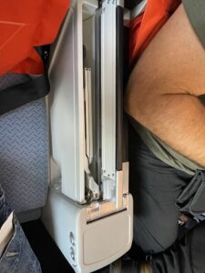 Das nächste große Thema bei der Premium Economy ist der Sitzabstand. Der ist am Bulkhead etwas größer, aber nicht wirklich zufriedenstellend. Für einen Bulkheadsitz fällt das Plus recht gering aus. Der einzige Vorteil, den der Bulkhead Sitz hat, ist dass der Reisende am Fenster (wenn die Beine lang genug sind) auf den Gang gelangen kann, ohne den Reisenden am Gang zu wecken oder zu stören.