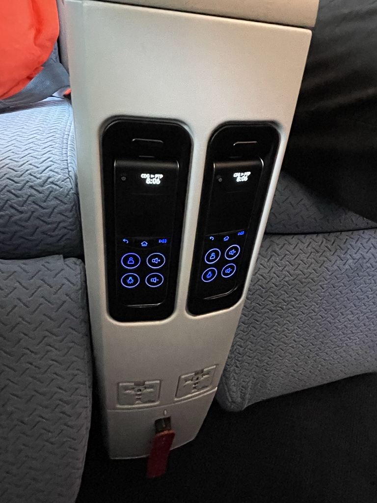 Vorne an der Armlehne befindet sich eine Universalsteckdose für größere elektronische Geräte sowie die kabelgebundene Fernbedienung für das Entertainmentsystem.