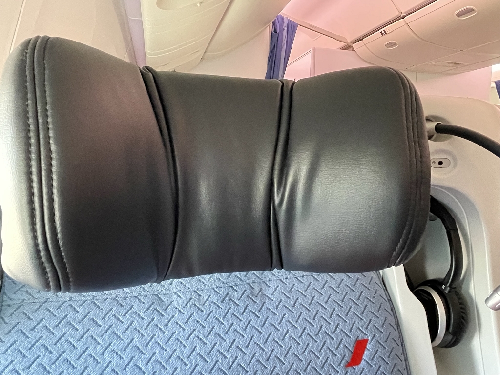 Die Kopfstütze ist aus Kunstleder, lässt sich höhenverstellen (um ca. 5cm) und die Seiten lassen sich zur Kopfunterstützung bzw. Halsentlastung nach vorne klappen. Die Rückenlehne ist wie in der Economy Class üblich starr, d.h. es kann keine Lordosenunterstützung o.ä. eingestellt werden. Dafür liegt ein Kissen am Platz, das man entweder als Kopfkissen oder zur Rückenunterstützung verwenden kann. Die Sitzfläche selbst ist weder besonders kurz noch lang, damit also unauffällig. Die Beinunterstützung brachte bei mir nichts, aber man kann sie mechanisch nach oben klappen lassen und dann wieder herunterdrücken.