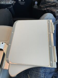 Das Tablett für das Essen befindet sich in der Armlehne und kann mit einer Lasche herausgezogen werden. Da es sich in der Mitte umklappen lässt, kann man mit ein wenig Geschicklichkeit aufstehen, ohne das Tablett in der Armlehne versenken zu müssen. Bei den anderen Sitzen in der Premium Economy befindet sich das Tablett am Vordersitz und kann auch dort hälftig umgeklappt werden.