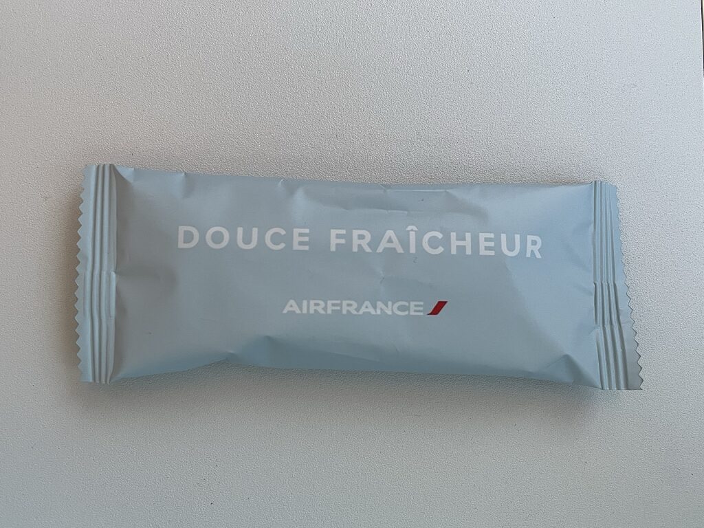 Vor Abflug wurden noch schnell die Kits Sanitaire, also kleine Briefchen mit OP-Maske und Desinfektionsgel verteilt. Dazu gab es noch ein eingeschweißtes feuchtes Tuch. Ein netter Touch.