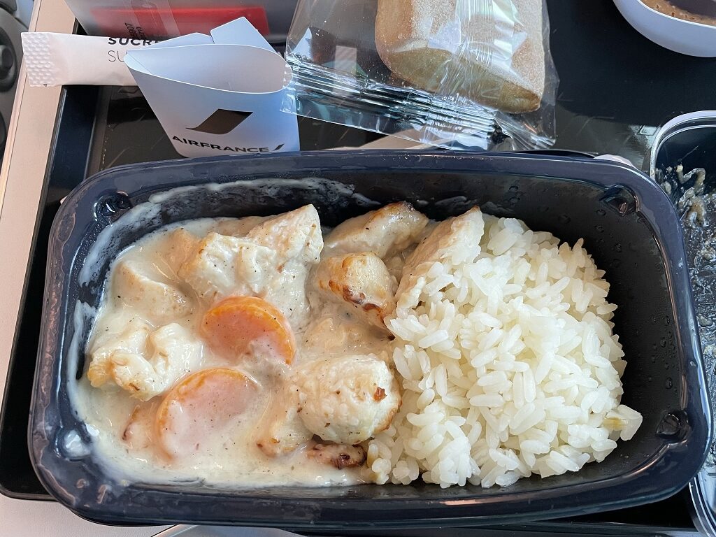 Wenn es auf dem Foto zwar nicht sonderlich lecker aussieht, war das Essen – gerade für ein Economy Class Essen – richtig gut. Auch der begleitende Champagner (Champagne Pannier) war auch nicht zu verachten. In der Galley konnte ich später den Champagner selbst immer wieder nachfüllen. Das ist für hinten im Flugzeug durchaus ungewöhnlich und weit über dem Durchschnitt.