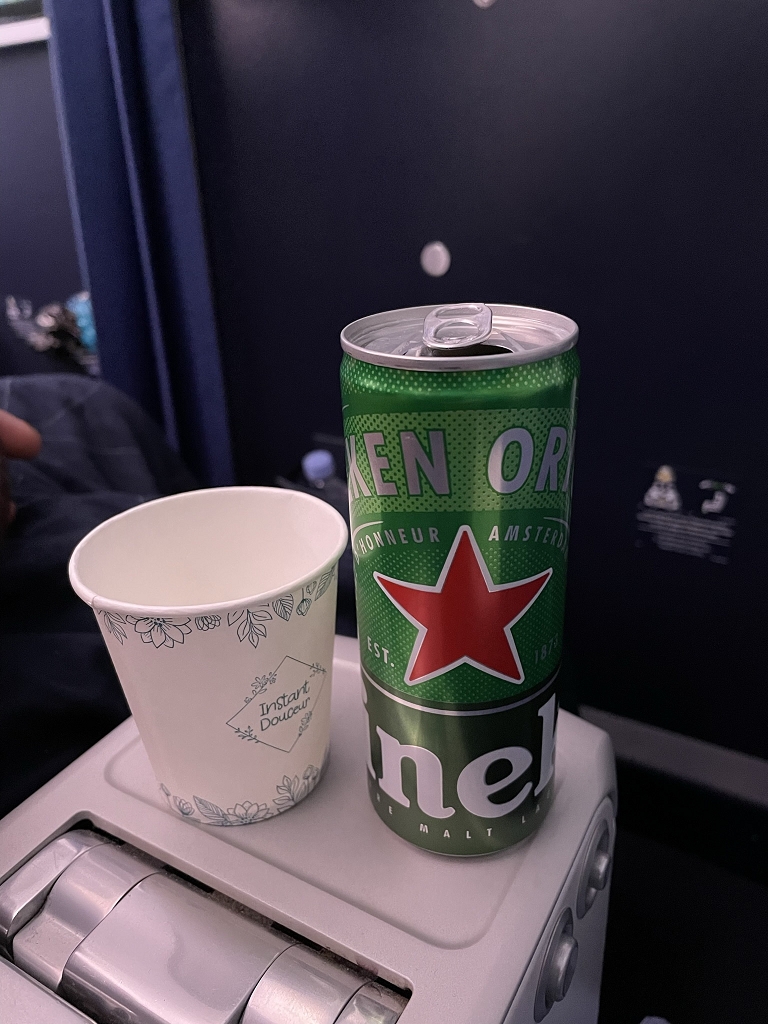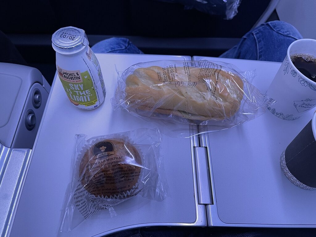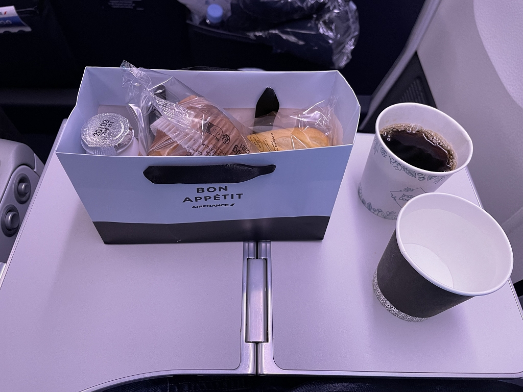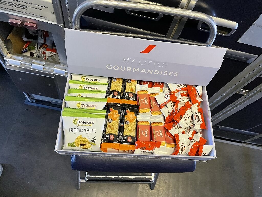 In der Galley gab es eine Snackbox und ein Tablett mit Getränken. Passagiere konnten dort Plastikbecher mit dem Getränkt der Wahl befüllen oder einen Flugbegleiter nach etwas fragen, was dort nicht stand. Das wurde dann schnell hervorgeholt und ausgehändigt. So gibt es z.B. Bier nur auf Anfrage. Dabei war es schön, dass sich Air France für französische Weine und holländisches Bier und nicht andersherum entschieden hat.