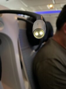 Direkt neben der Kopfstütze befinden sich eine bewegliche Leselampe und geräuschunterdrückende Kopfhörer. Bei Bedarf kann man diese ausstöpseln und eigen Kopfhörer verwenden. Mein Eindruck war, dass meine Bose QC35i eine bessere Außengeräuschunterdrückung hatten, als die von Air France zur Verfügung gestellten Kopfhörer. Das Modell ist übrigens mit denen in der Business Class identisch. Air France verteilte leider keine „Überzieher“ für die Kopfhörer an Bord. Zusammen mit dem Eindruck der Sitztasche und der Toilette hinterließ dieses kein gutes Gefühl bei mir.