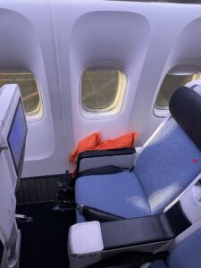 Die Sitze sind richtige Brocken. Durch die Schale, in der sich die Sitze befinden, wirkt die Kabine reihenweise in Abschnitte getrennt, denn zwischen den Sitzen ist eine Blende angebracht, so dass ein vollständiger Sichtschutz besteht. Die Sitze sind in hellem Blau mit einer dunkelblauen Kopfstütze gehalten. Alle bieten eine ausfahrbare Beinstütze, die sich jedoch nur für kleine Menschen lohnt.
