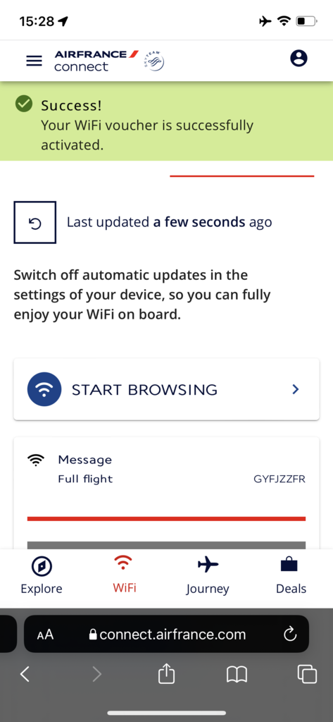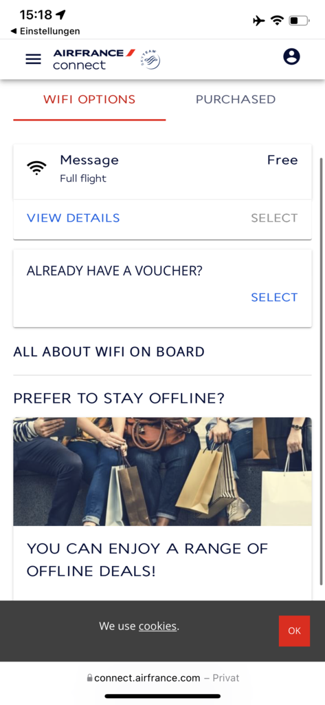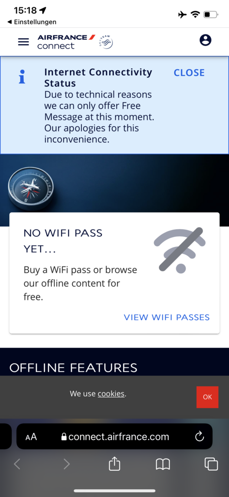 Bei Air France fliegt das Internet mit. Und das Beste ist, dass der Basistarif (Messenger) für alle Passagier an Bord gratis ist. Damit kann man Textnachrichten verschicken, aber keine Fotos oder Videos live aus dem Flugzeug verschicken. Aber die Möglichkeit, wenigstens per Messenger mit Menschen in Kontakt zu bleiben ist einfach nur positiv.