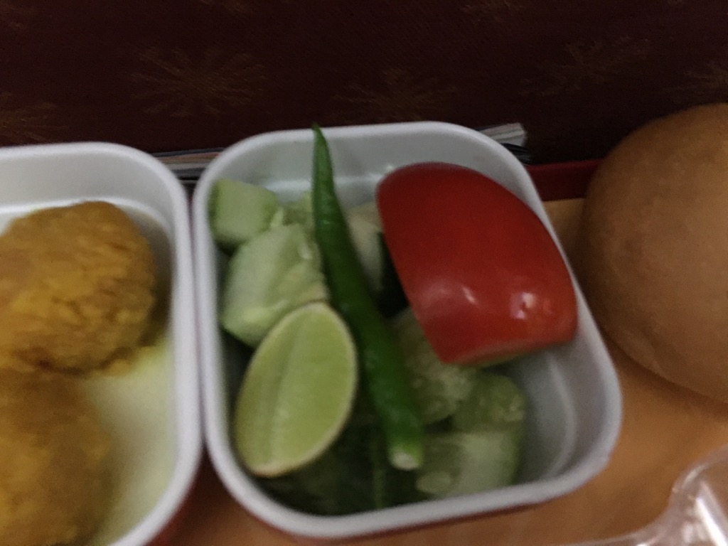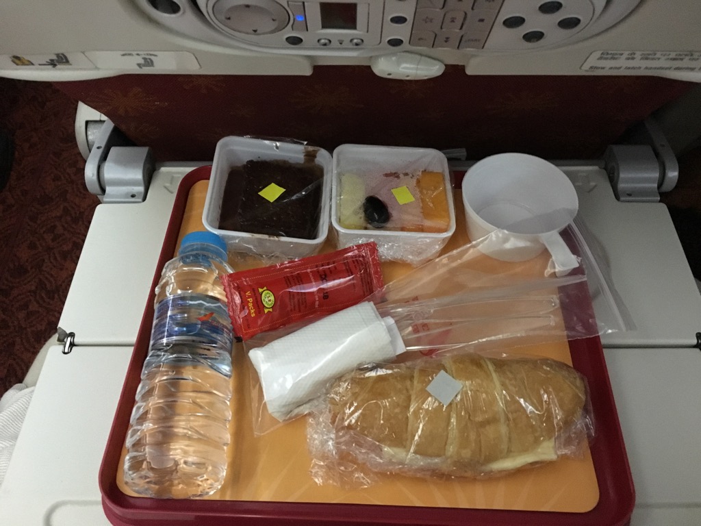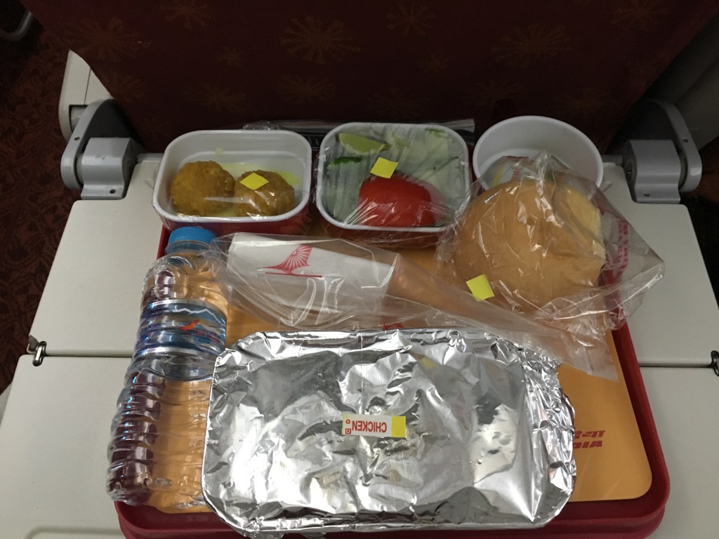 Nach dem Aperitif wurde der Hauptgang serviert. Dabei hat man in der Air India Economy Class die Auswahl aus vegetarischem- und nicht vegetarischen indischen Essen. Ich selbst bin kein Fan von indischem Essen, zumindest wenn es nicht sehr gut ist, allerdings war das servierte Essen völlig in Ordnung.