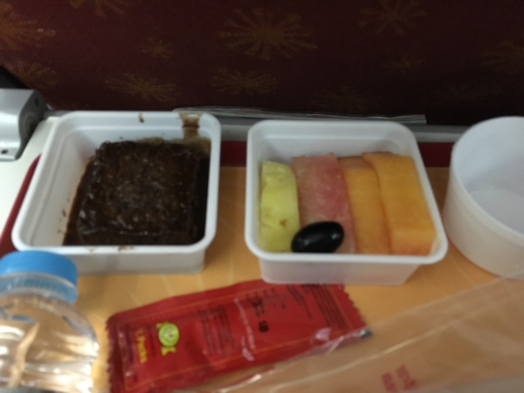 Was mich aber ein wenig verwirrt hat war, dass keine weiteren Getränke zum Hauptgang serviert wurden. Man hatte einige Falschen Wein und Whiskey auf dem Wagen stehen, aber leider kein Wasser und meine Frage nach Wasser wurde wieder mit „later!“ beantwortet.