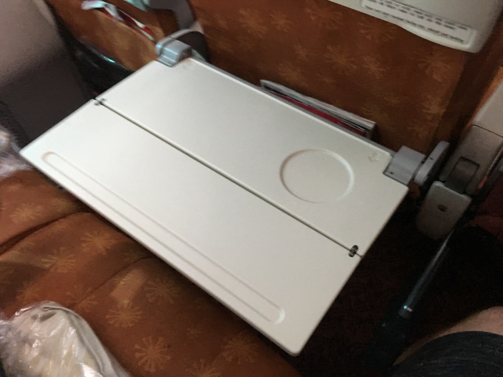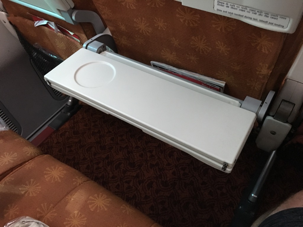 Der Tisch ist, wie bei vielen Airlines, auch bei Air India zweigeteilt und lässt sich halb herunter klappen, z.B. um nur Getränke abzustellen. Was grundsätzlich sehr angenehm sein kann, führt allerdings auch zu recht instabilen Tischen. Wenn man hierauf mit dem Laptop arbeitet, schwingt der Tisch sehr und leider ist er auch nicht ganz eben.