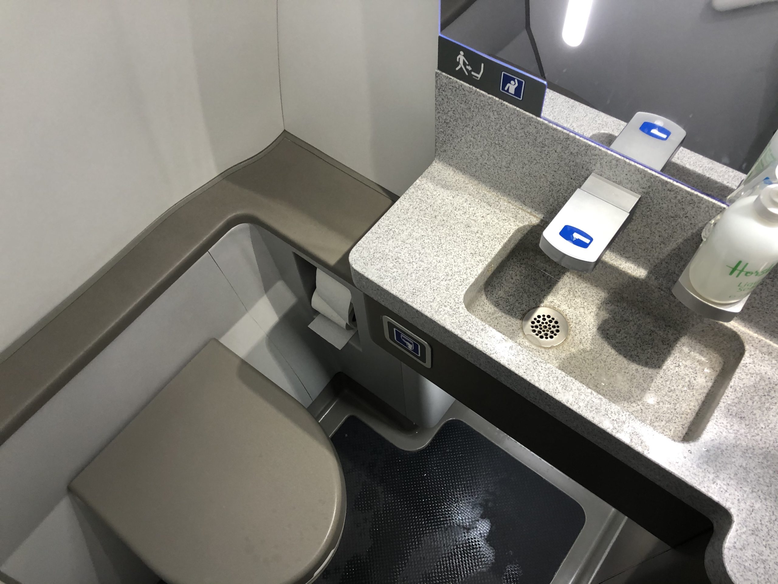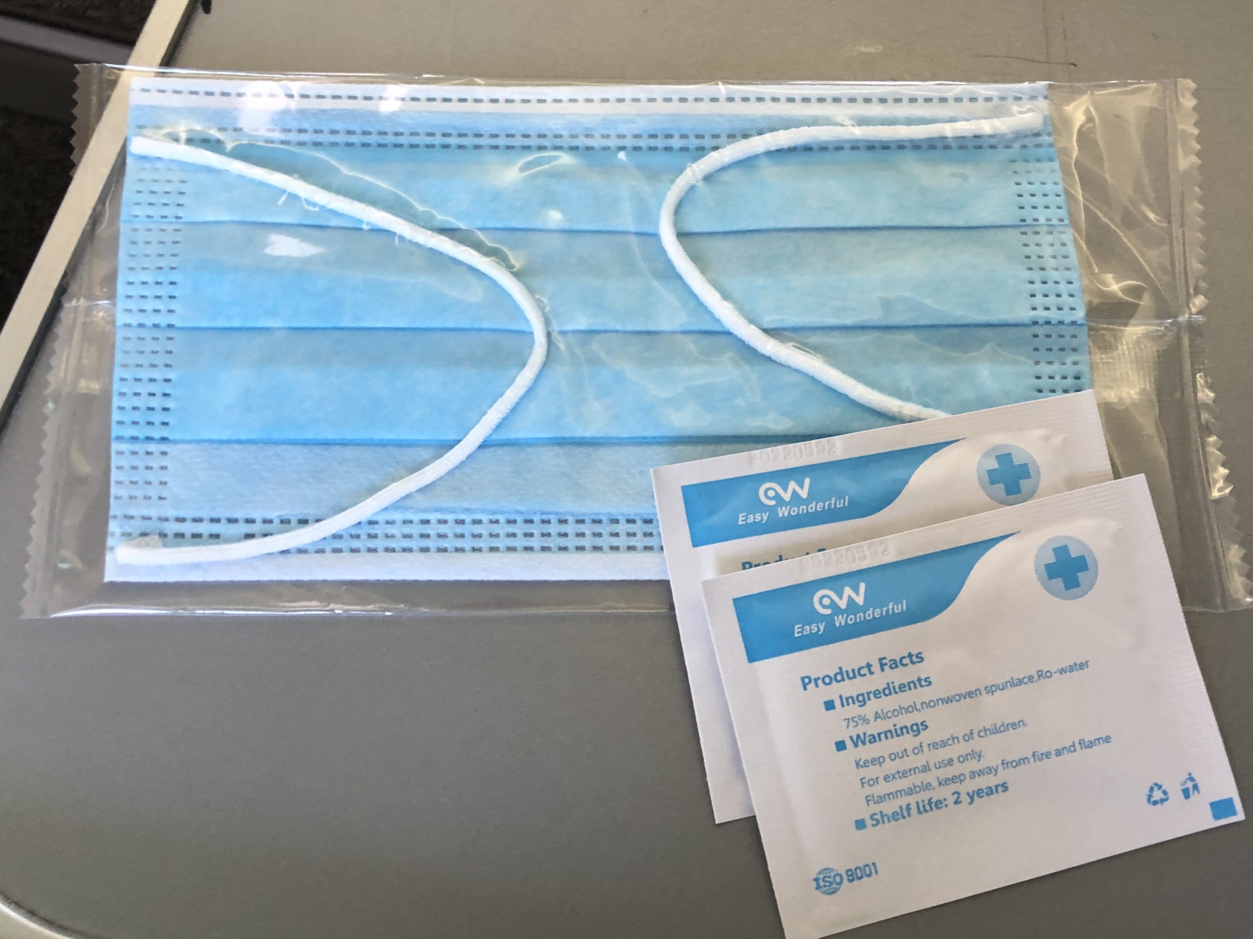 Nach dem warmen Empfang der Flugbegleiterin wurden mir das Bordmagazin und eine Getränkekarte überreicht. Das Magazin ist zur Zeit nicht ausgesteckt, wird aber allen Gästen nach Wunsch ausgehändigt. Beim Boarding erhält jeder Passagier einen Umschlag mit Maske und Desinfektionstüchern. Zusätzlich dazu gibt es einige Hinweise und Verhaltensregeln.