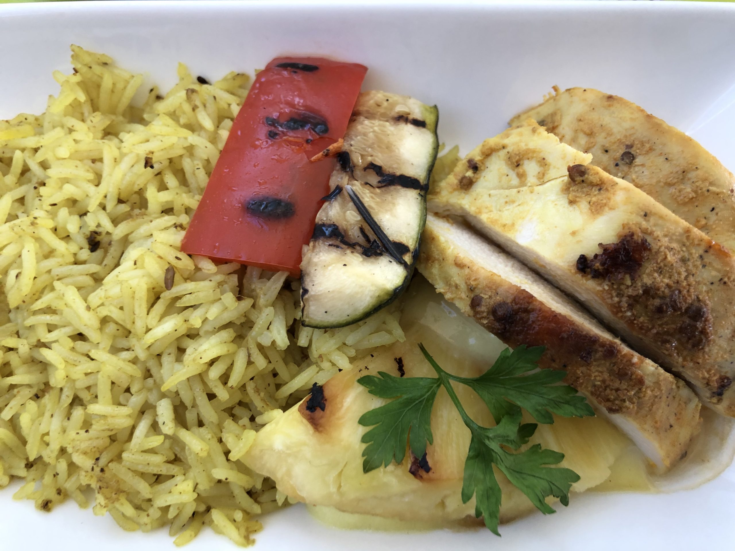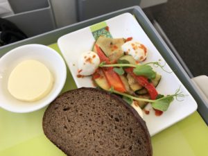 Ein Tablett mit Salat, warmem Hauptgang und Dessert wurde kurze Zeit später gereicht. Dazu kam einzeln abgepacktes Brot aus dem Korb. Dieses war aber gar nicht trocken und wurde von der Stewardess als typisches Brot aus Lettland angepriesen. Zur Vorspeise gab es einen Salat, danach Hühnchen mit Reis und eine ziemlich sahniges Dessert mit Mango/Passionsfrucht.