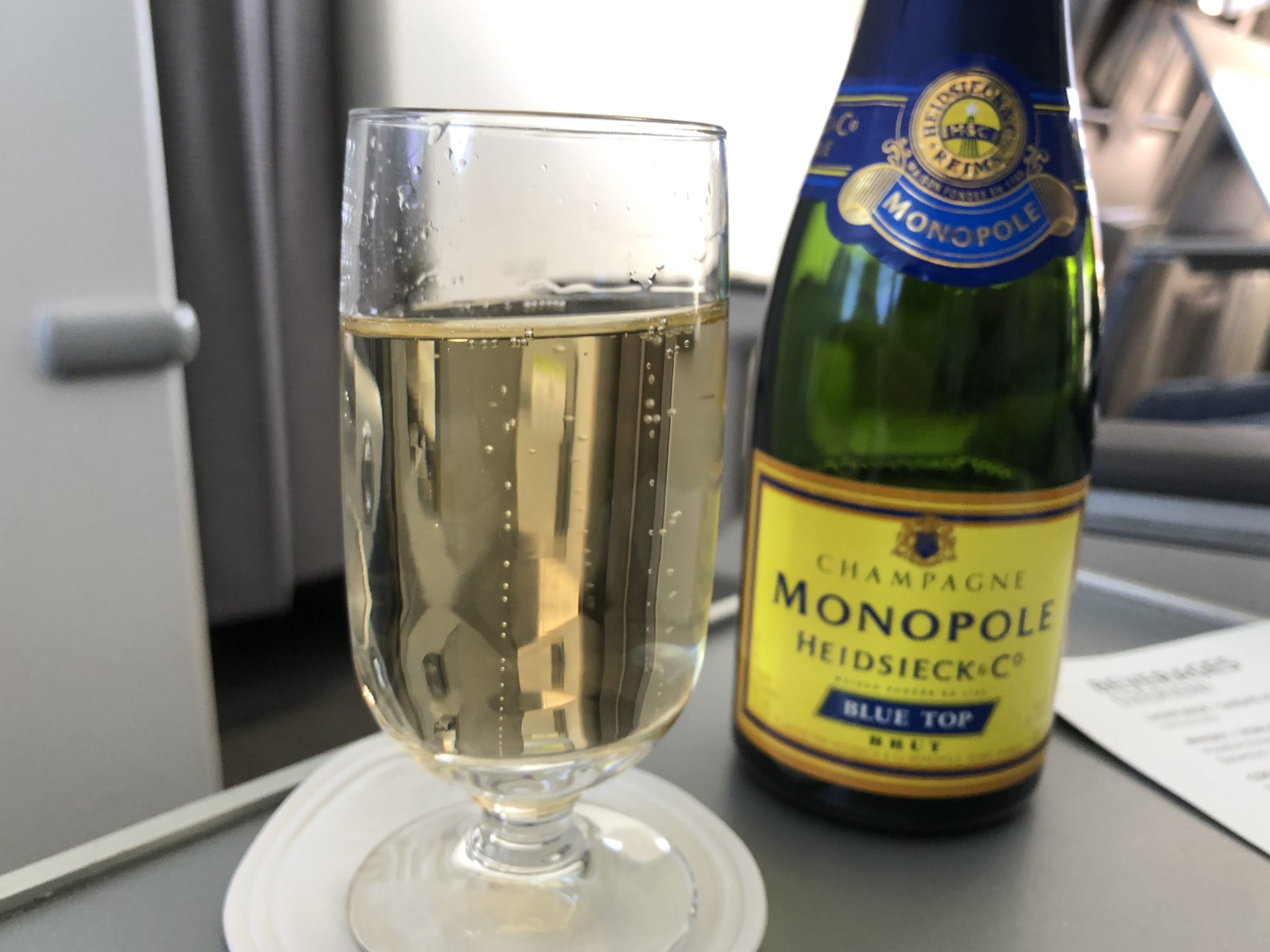 Nach dem Start verteilten die drei Flugbegleiterinnen Formulare zur Registrierung, diese wurden noch an Bord wieder eingesammelt. Die Getränkekarte war für den Flug sehr reichhaltig: neben Sotdrinks und Säften wurden Bier und jeweils zwei Rot- und Weißweine angeboten. Ich habe mich zum Start in den Urlaub für den Champagner von Heidsieck Monopole entschieden.
