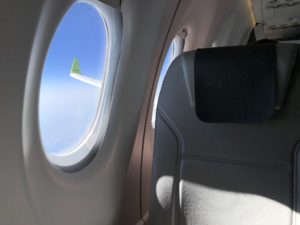 Ich hatte vom Schalter 3A zugewiesen bekommen und mich an Bord eine Reihe weiter nach vorne auf 2A umgesetzt. Die Beinfreiheit war sehr gut, der Klapptisch in der Armlehne aber winzig. Es weckte sofort Erinnerungen an den Flug mit der ehemaligen CSeries von Swiss. Die Klapptische in den dahinter liegenden Reihen sind da etwas stabiler. Für den Laptop und als Ablage für Getränke war die Mittelkonsole dann aber ganz praktisch.