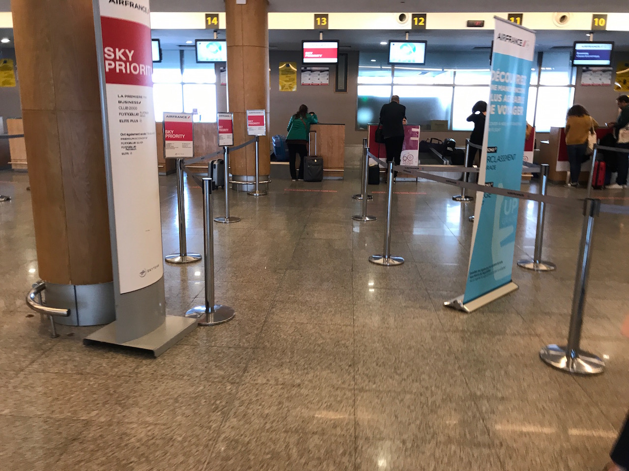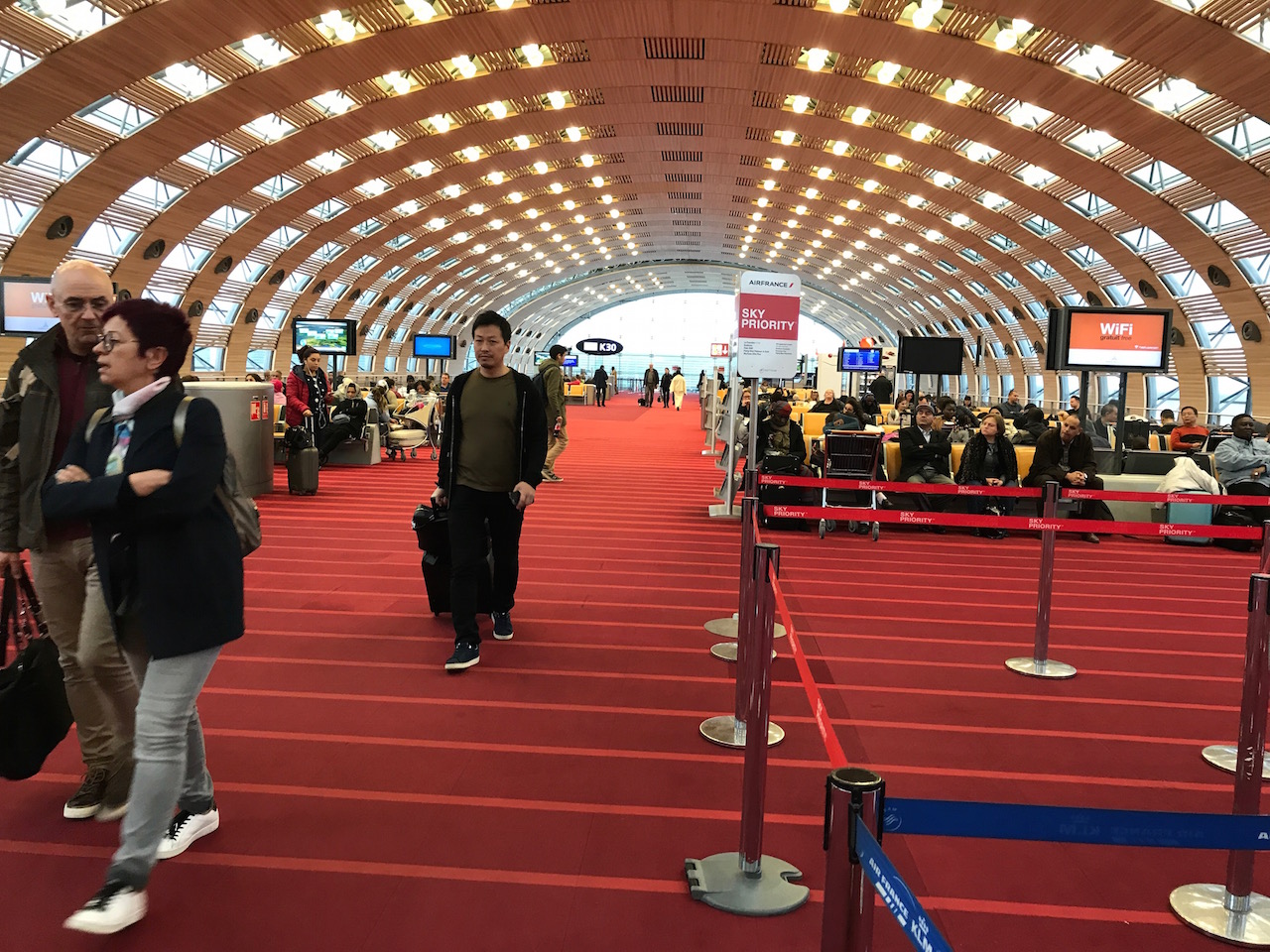 Mein Flug aus Paris Charles-de-Gaulles wurde im non-Schengen Terminal 2E abgefertigt. Da mein Flug um 10.25 Uhr startete, kam ich in den Genuss der Rushhour – dies gilt grob zwischen 8 und 11 Uhr auf Grund der Nordamerikaflüge und 17 bis 20 Uhr für die Asienflüge im Terminal 2E, da das Terminal 2E den Check In sowie die Sicherheits- und Passkontrolle für die direkt angeschlossenen K-Gates und die Satelliten-Gates L und M abdeckt. Durch meinen Air France Skyteam Elite Plus Status konnte ich die Sky Priority Pass- und Sicherheitskontrolle nutzen, musste aber nichtsdestotrotz 50 Minuten für eben diese anstehen. Gäste die nicht über diesen Vorteil verfügten, warteten ungefähr 80 Minuten. So extrem ist es aber nur, wenn man zu den genannten Zeiten aus Paris einen non-Schengen Flug antritt. Als Umsteiger sind die Transitkontrollen zeittechnisch sehr human.