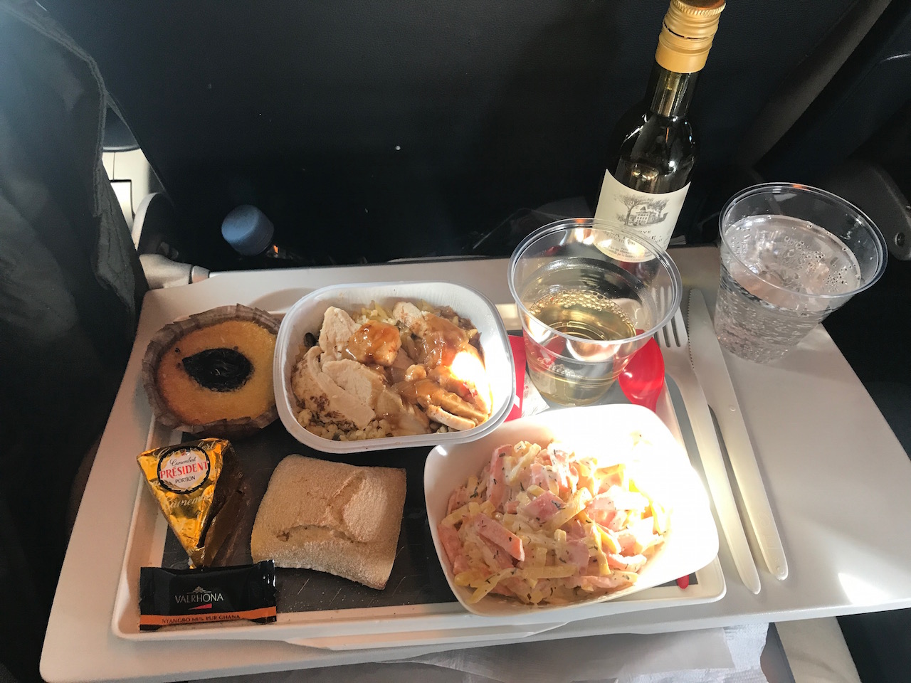 Auf meinem Flug in der Economy Class begann der Service ungefähr eine Stunde nach dem Start in Paris. Die warme Mahlzeit wurde gleichzeitig mit den Getränken serviert. Die Mahlzeit bestand aus einem sehr unspektakulären Möhrensalat mit einem Joghurt-Dressing, einem sehr saftigen und schmackhaften Hähnchenragout an Risotto, einer Ecke Camembert mit Ciabatta Brötchen, einem kleinen Pflaumenküchlein und einer kleinen Tafel Schokolade aus dem Hause Valrhona. Bis auf die Vorspeise waren alle Komponenten, besonders für eine Economy-Mahlzeit, überdurchschnittlich in Puncto Qualität und Quantität. Lediglich, dass Air France ein billiges Plastikbesteck in der Economy Class vorsieht, hat mich gestört, da die Mahlzeit ansonsten wirklich sehr gut war. Ungefähr eine halbe Stunde nach dem Servieren des Mittagessens wurden die Tabletts eingesammelt und Tee und Kaffee angeboten. Die verbleibende Stunde bis Rabat habe ich es mir auf meinem Fensterplatz in der A319 bequem gemacht und ein wenig Schlaf nachgeholt.