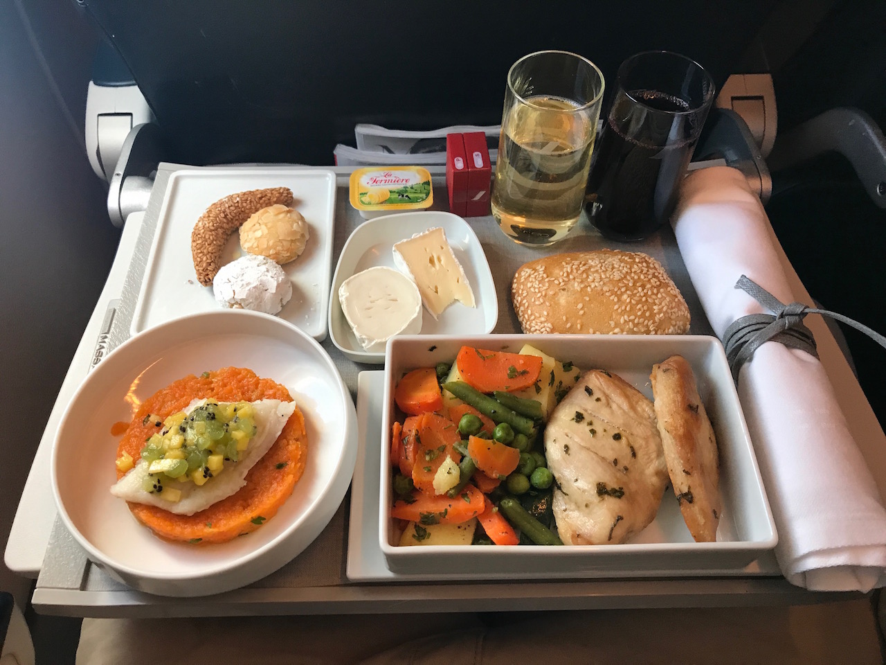 Was den Champagner angeht, so spielt man bei Air France meist etwas Roulett, die Palette in der Business Class reicht von einem etwas simpleren Laurent Perrier Brut bis zum exklusiven Krug Grand Cuvée – dies ist zwar ein wahres Luxusproblem, aber so lernt man auch verschiedene Champagner kennen. Der Lunch-Service begann etwa 45 Minuten nach dem Start. Als Vorspeise wurde eine Dorade auf einem marokkanischen Karotten Püree und einem Mango-Kiwi Confit gereicht – man konnte wirklich (positiv) schmecken, dass die Maschine in Rabat frisch von einem örtlichen Caterer beladen wurde. Beim Hauptgericht entschied ich mich wie fast immer für das Hähnchen an marokkanischem Gemüse – dass in Marokko Fleisch meist durchgegart gereicht wird, hatte ich schon wieder verdrängt und ich muss gestehen, dass dies das mit Abstand trockenste Fleischgericht war, das ich je in einem Flugzeug gegessen habe. Dies war für mich besonders enttäuschend, da ich bis zu meinem Flug am Mittag noch keine Zeit hatte etwas zu essen und bisher in Puncto Catering noch nie von Air France in der Business Class enttäuscht wurde. Aber naja, so etwas passiert und die Crew hat diesen Patzer durch einen hervorragenden Service mehr als gutgemacht.