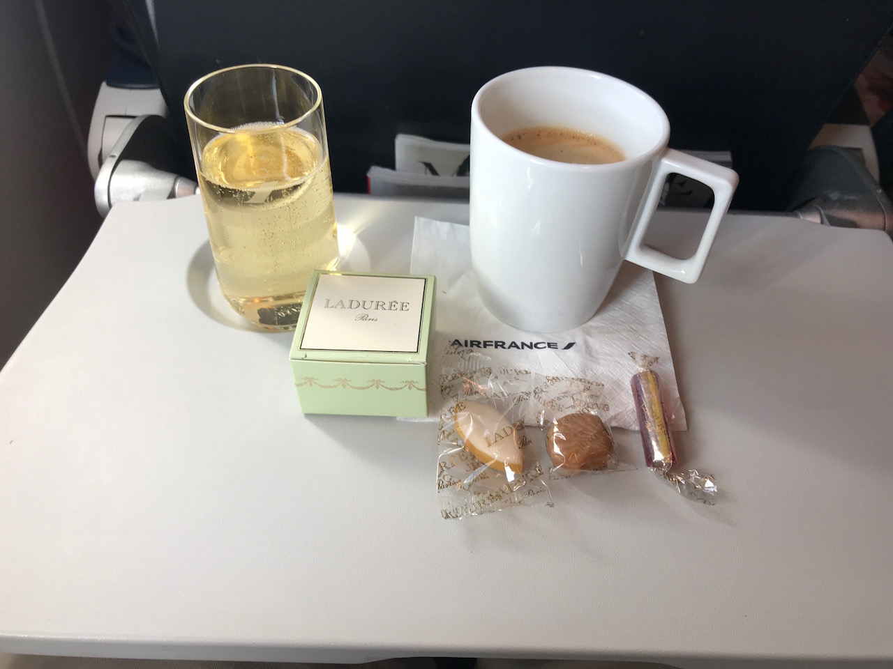 Nach dem Hauptservice kamen die Flugbegleiter regelmäßig durch die Kabine und versorgten alle Gäste mit Getränken, sowie weiteren süßen Kleinigkeiten bis kurz vor der Landung in Paris.