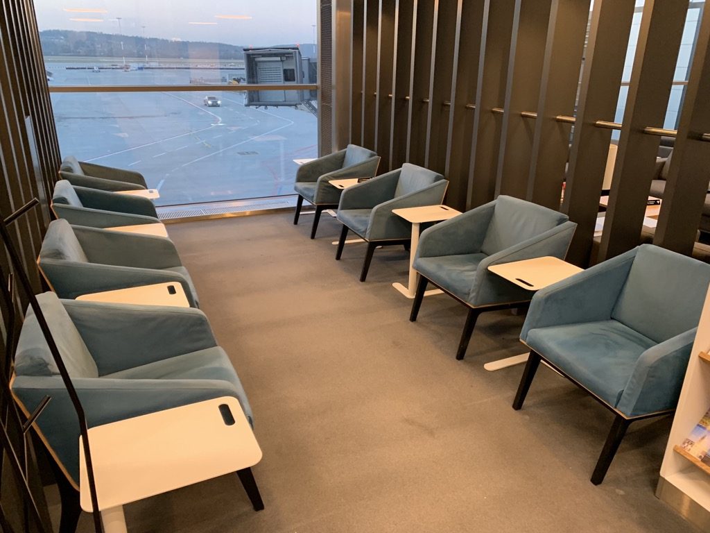 Die Lounge selbst ist in mehrere Bereiche unterteilt, hierfür verwendet man zur optischen Abgrenzung einige Raumtrenner. Kurz hinter dem Eingang und entlang der großen Fensterfront findet man eine Reihe von Sesseln in großen Sitzgruppen. Besonders das Tageslicht und der Blick auf das Vorfeld sind ein großer Vorteil der Lounge.