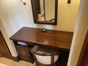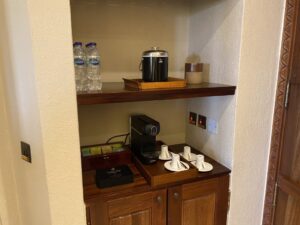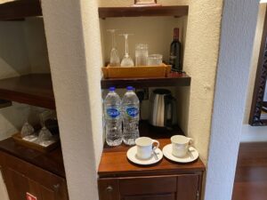 Direkt hinter der Tür befindet sich ein kleiner Eingangsbereich, in dem ein Schminktisch, eine Minibar und Kaffeemaschine untergebracht sind. Hier stand auch ausreichend kostenfreies stilles Wasser bereit, um über den Tag zu kommen.