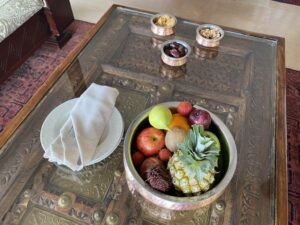 Im Al Maha angekommen wurden wir herzlich begrüßt und in das Hauptgebäude gebeten. Hier meldet man sich zum Check-In nicht klassisch an einer Rezeption, sondern man wird in einen Nebenbereich begleitet, in dem man Platz nehmen kann, während die Formalitäten erledigt werden. Hier erwarteten uns bereits Smoothies zur Begrüßung.