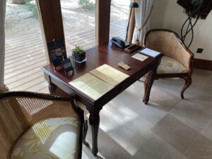 Während des Check-In Prozesses wurden uns alle Details zum Resort erklärt. Wir wurden über die freilaufenden (harmlosen) Tiere aufgeklärt, der kostenfreie Roomservice und Essenszeiten im Restaurant sowie kostenfreie Ausflüge wurden uns als Option vorgeschlagen. Dazu aber später mehr. Kurze Zeit danach konnten wir zu unserer Villa aufbrechen – wir wurden mit einem Golfcar gefahren.