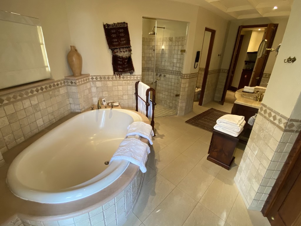 Auf der rechten Seite konnte man das Badezimmer betreten, welches mit einem Doppelwaschbecken, einer großen (!!) Badewanne, Dusche und WC ausgestattet war. Die ganze Suite und auch das Badezimmer sind in einem Stil eingerichtet, der an ein Beduinenzelt erinnert. Im Badezimmer lagen viele Handtücher und eine vollständige Ausstattung an Amenities bereit.