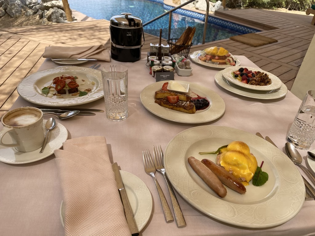 Ein zusätzlicher Grund, warum wir das Al Maha Resort gebucht haben, war der Fakt, dass in den Buchungen kostenfreie Verpflegung integriert ist. Gerade bei solch abgelegenen und privaten Hotels zahlt man sich oft an den Nebenkosten dumm und dämlich – das kann hier nicht passieren.