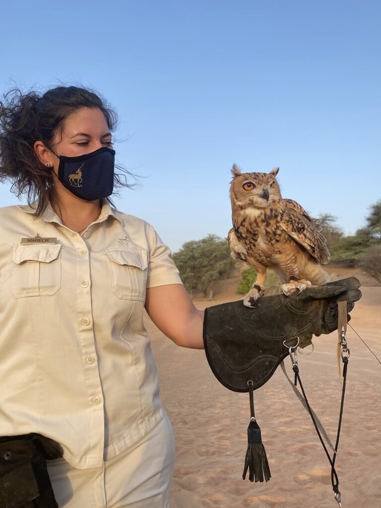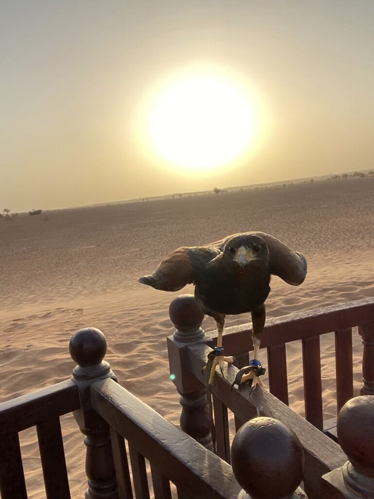 Wir haben einen Sundowner mit Sekt und kühlen Getränken in der Wüste gebucht und die Falknerei besucht. Während ein Teil der Gäste mit Kamelen zum Sundowner geritten kam, wurden wir mit dem Auto gefahren. Ein wahnsinns Gefühl, wenn man plötzlich mitten in der Wüste steht und um einen herum nichts außer Sand ist. Bei der Falknerei konnten wir einiges über den Sinn einer Falknerei und das Training der Vögel lernen.