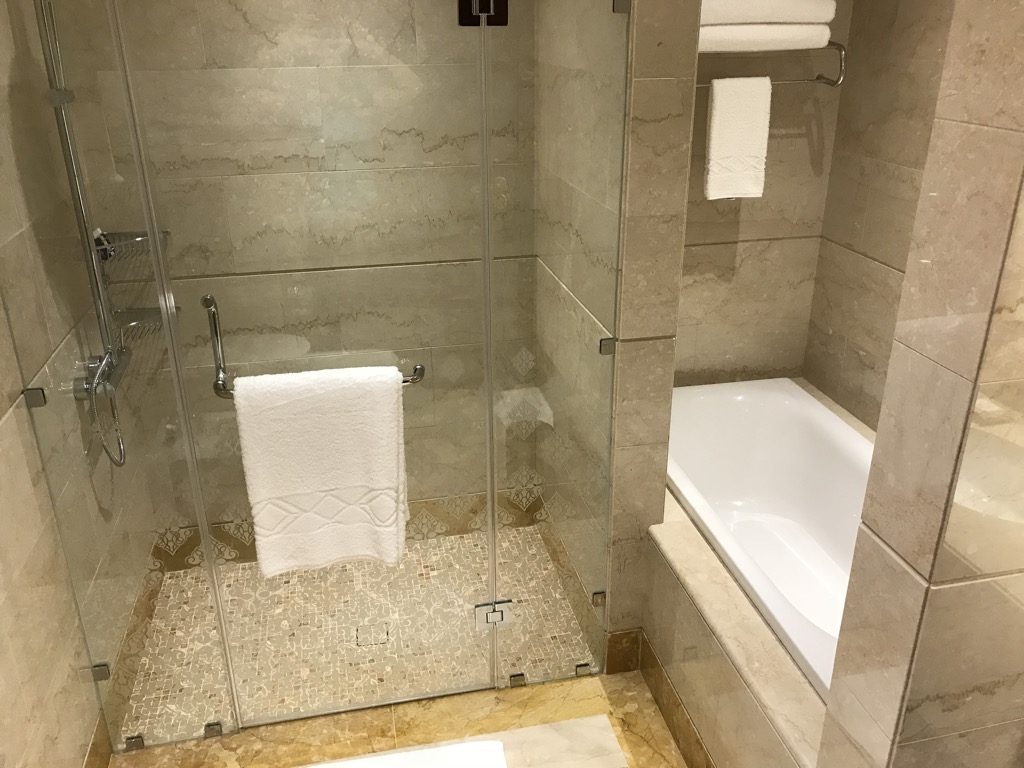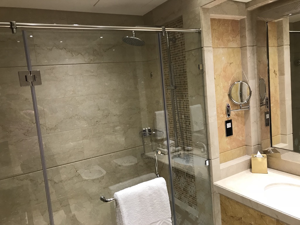 Direkt nach dem Eintreten befand sich auf der linken Seite das großzügige Bad, welches neben der Toilette und einem Waschbecken mit einer begehbaren Dusche inklusive Regenduschkopf ausgestattet war. Am Waschbecken durften wir eine vollständige Auswahl an Amenities vorfinden, was wir immer sehr zu schätzen wissen.
