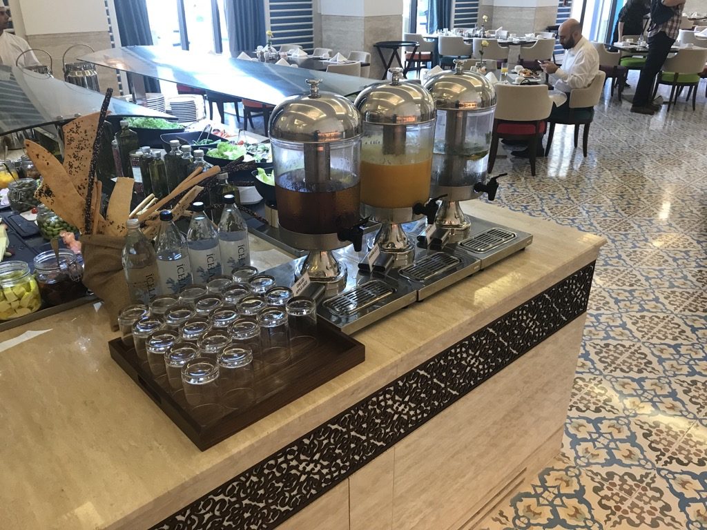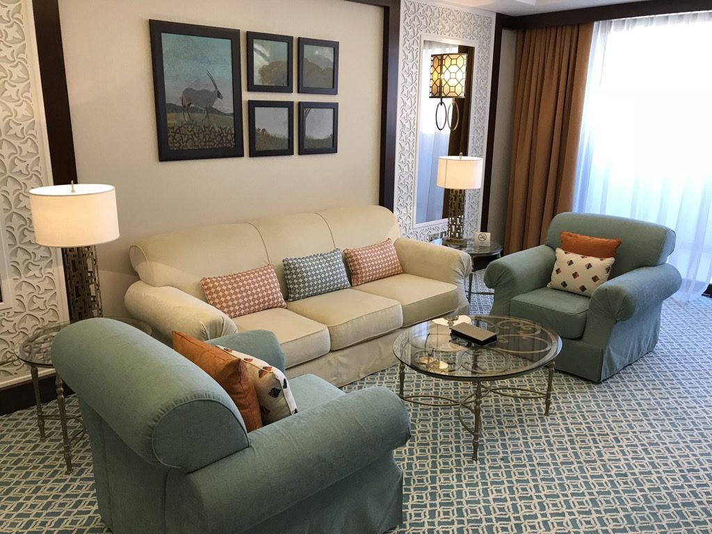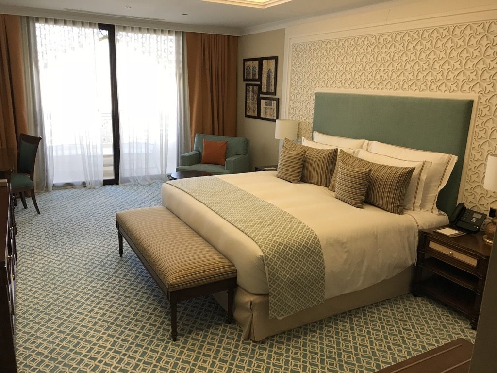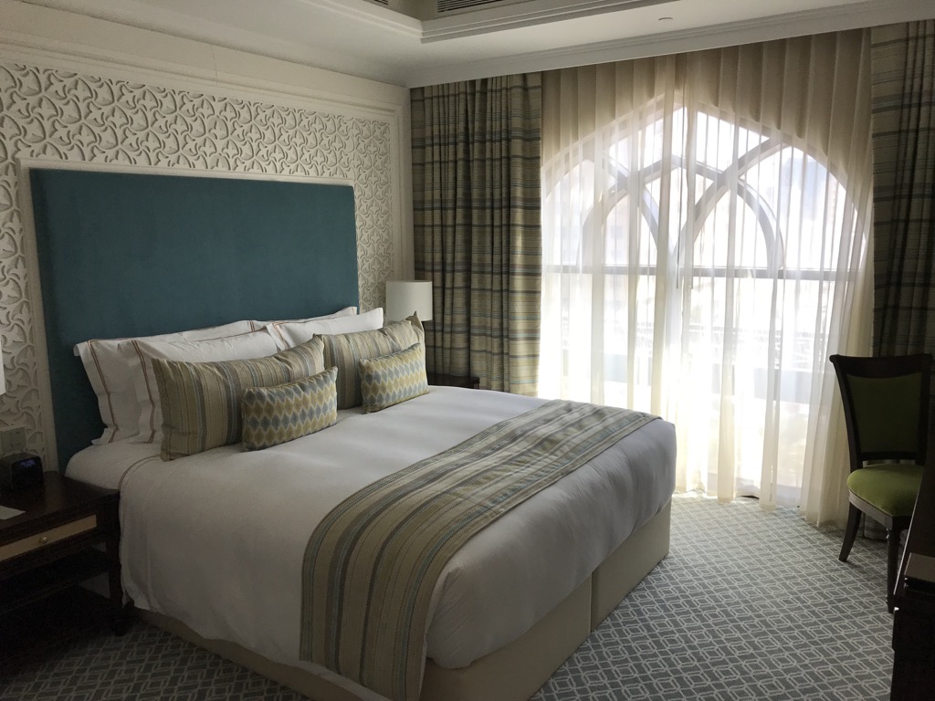 Im Zimmer angekommen wurde und das Zimmer, die Klimaanlage und auch die Minibar erklärt und vorgestellt. Das komplette Hotel mit allen Einrichtungen war sehr klar in einem durchgängigen geschmackvollen arabischen Stil gehalten, welcher uns sehr gefallen hat. Dieser Stil war auch bei der Minibar zu finden, denn es war eine „dry“ Minibar, welche nur Wasser, Säfte und Softdrinks enthielt. Dies stellte für uns absolut kein Problem dar. Ich trinke sowieso so gut wie nie Alkohol und es schadet ja auch niemandem sonst ein paar Tage darauf zu verzichten. Nun aber zurück zum Zimmer.