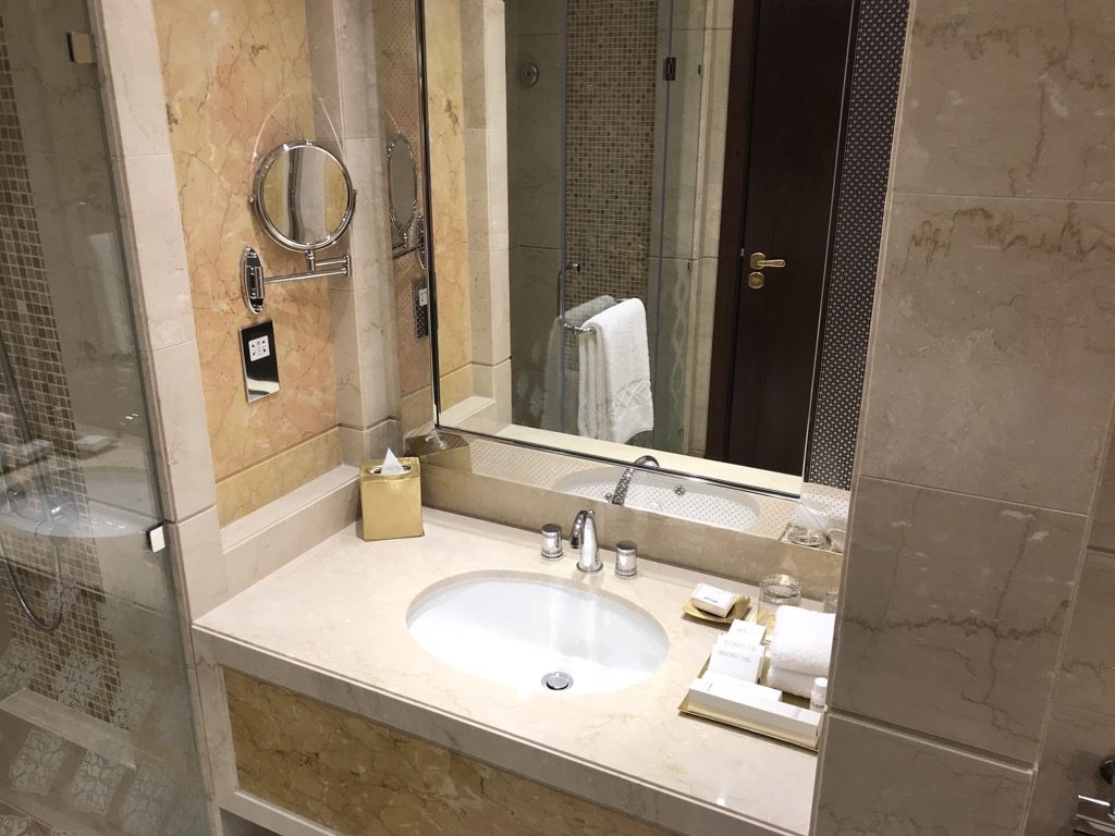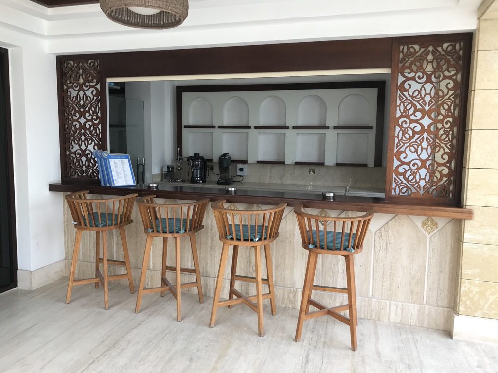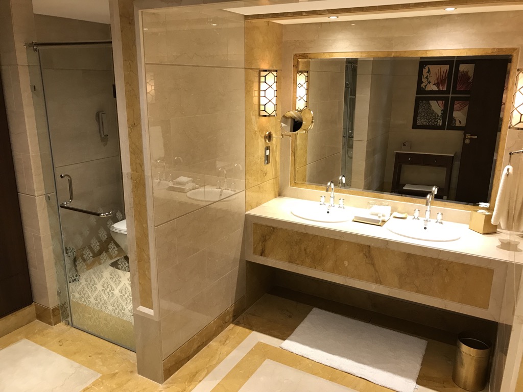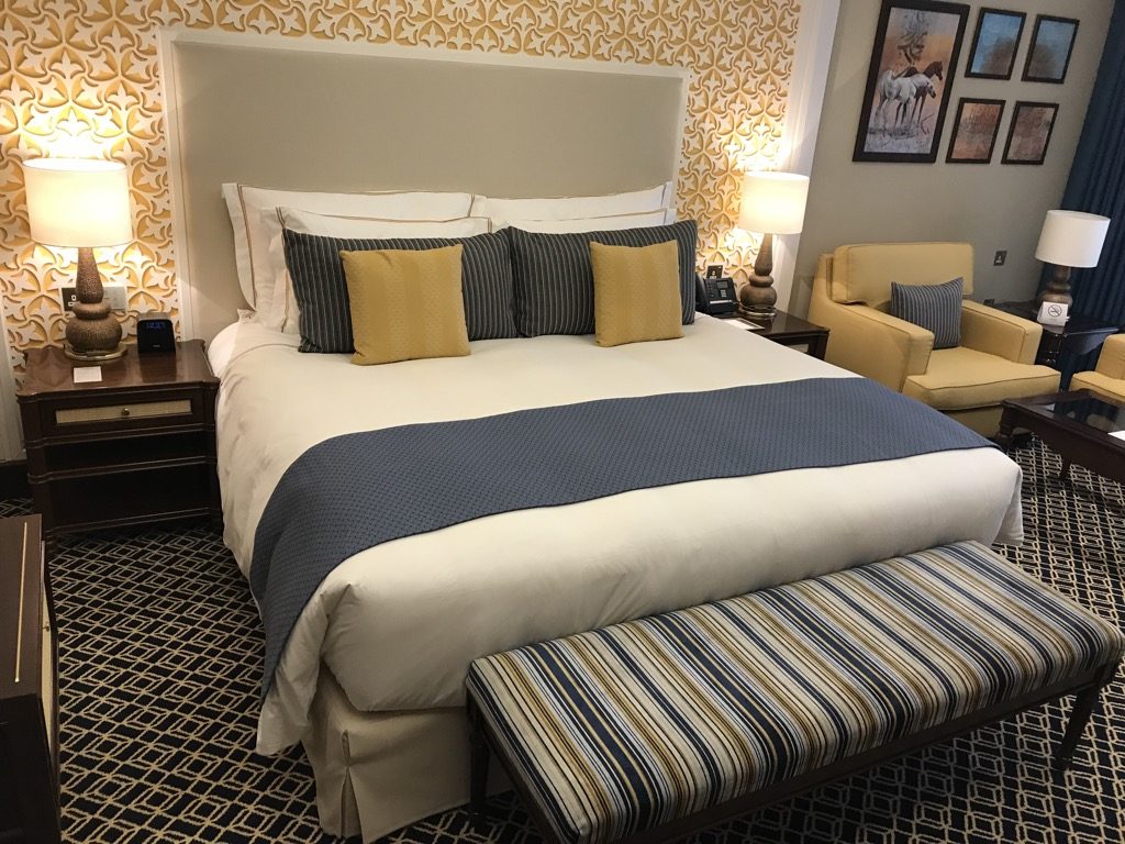 Im Zimmer angekommen wurde und das Zimmer, die Klimaanlage und auch die Minibar erklärt und vorgestellt. Das komplette Hotel mit allen Einrichtungen war sehr klar in einem durchgängigen geschmackvollen arabischen Stil gehalten, welcher uns sehr gefallen hat. Dieser Stil war auch bei der Minibar zu finden, denn es war eine „dry“ Minibar, welche nur Wasser, Säfte und Softdrinks enthielt. Dies stellte für uns absolut kein Problem dar. Ich trinke sowieso so gut wie nie Alkohol und es schadet ja auch niemandem sonst ein paar Tage darauf zu verzichten. Nun aber zurück zum Zimmer.