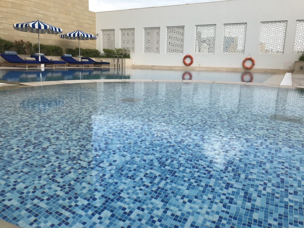 Im ersten Stockwerk des Hotels befand sich ein Außenpool. Auch dieser Bereich war sehr schön gestaltet und lud egal ob mit Liegen oder Stühlen zum Verweilen ein. Im Poolbereich gab es noch eine bediente Bar, an der man entweder draußen oder im klimatisierten Innenbereich einen Kaffee genießen konnte.
