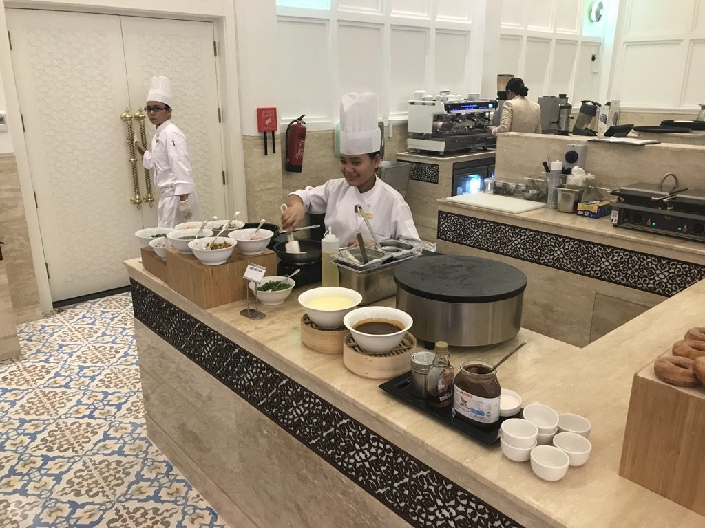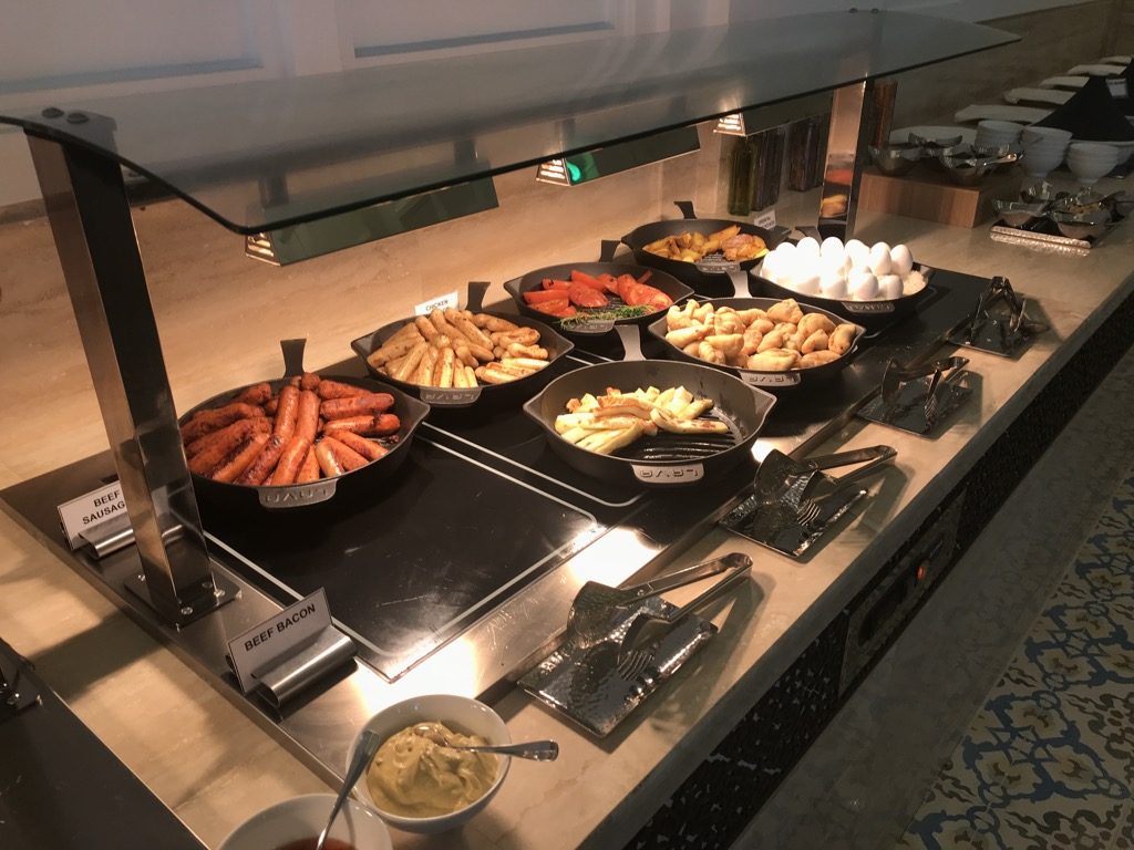 Das Buffet wirkte im ersten Moment nicht übermäßig groß, bot aber alles was das Herz begehrte. Es gab eine große Auswahl an Backwaren, Aufstrichen, Wurst, Käse und Obst. An der Seite waren eine ganze Reihe warmer Speisen aufgebaut. Diese Auswahl ergänzte die Live Cooking Station für Eierspeisen und Pancakes wunderbar. Alle Speisen und Getränke die wir probiert haben waren von ausgezeichneter Qualität. Auch hier war das Personal sehr freundlich und hat regelmäßig geschaut ob noch etwas benötigt wird.