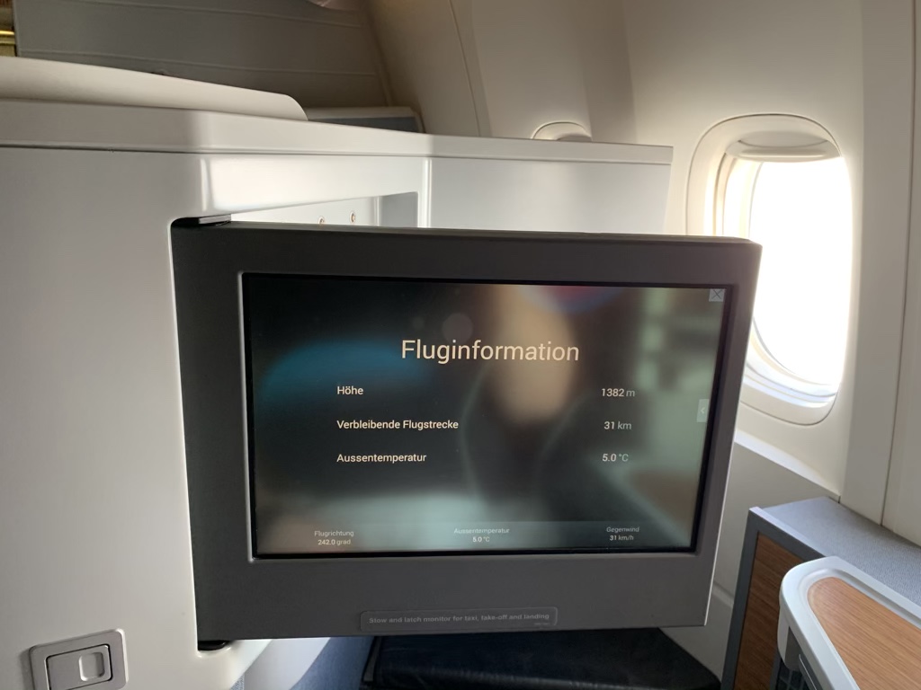 Ich hatte einen Fensterplatz in Reihe vier reserviert. Dieser befand sich allerdings recht nahe an den Toiletten und der Küche. Wenn man sehr lautstärkeempfindlich beim Schlafen ist, sollte man entweder Reihe 3 wählen oder einen Sitz in der hinteren Kabine.
