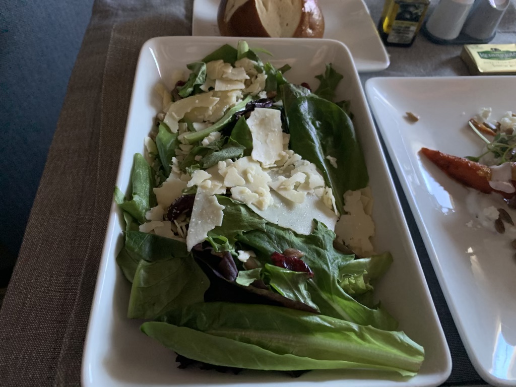 Die Vorspeise mit „gerösteten Karotten und Schafskäse“ war überraschend gut und auch den Salat konnte man essen. Nachdem ich z.B. auf dem Flug von London nach Dallas noch fast das komplette Essen habe zurück gehen lassen, war das Catering ab Los Angeles durchaus gut.
