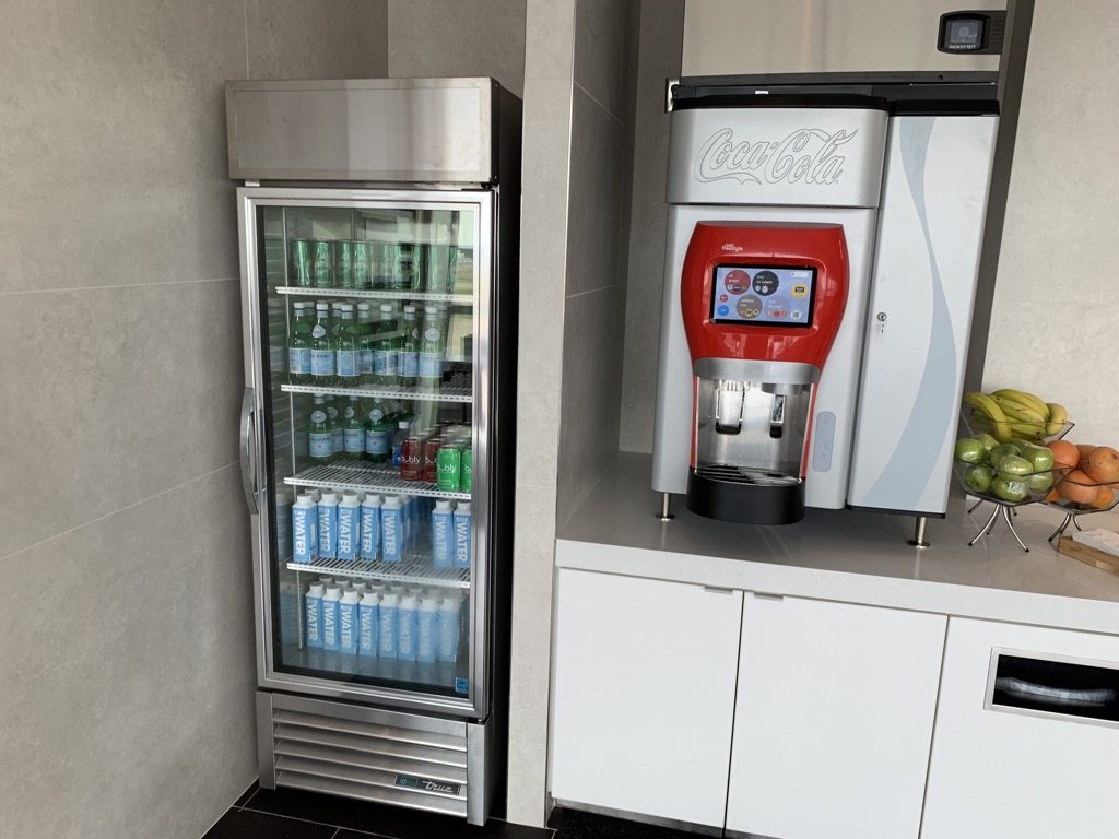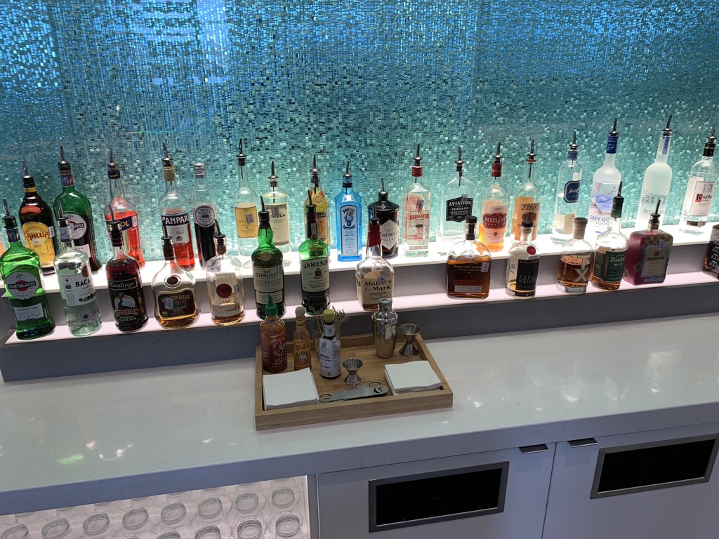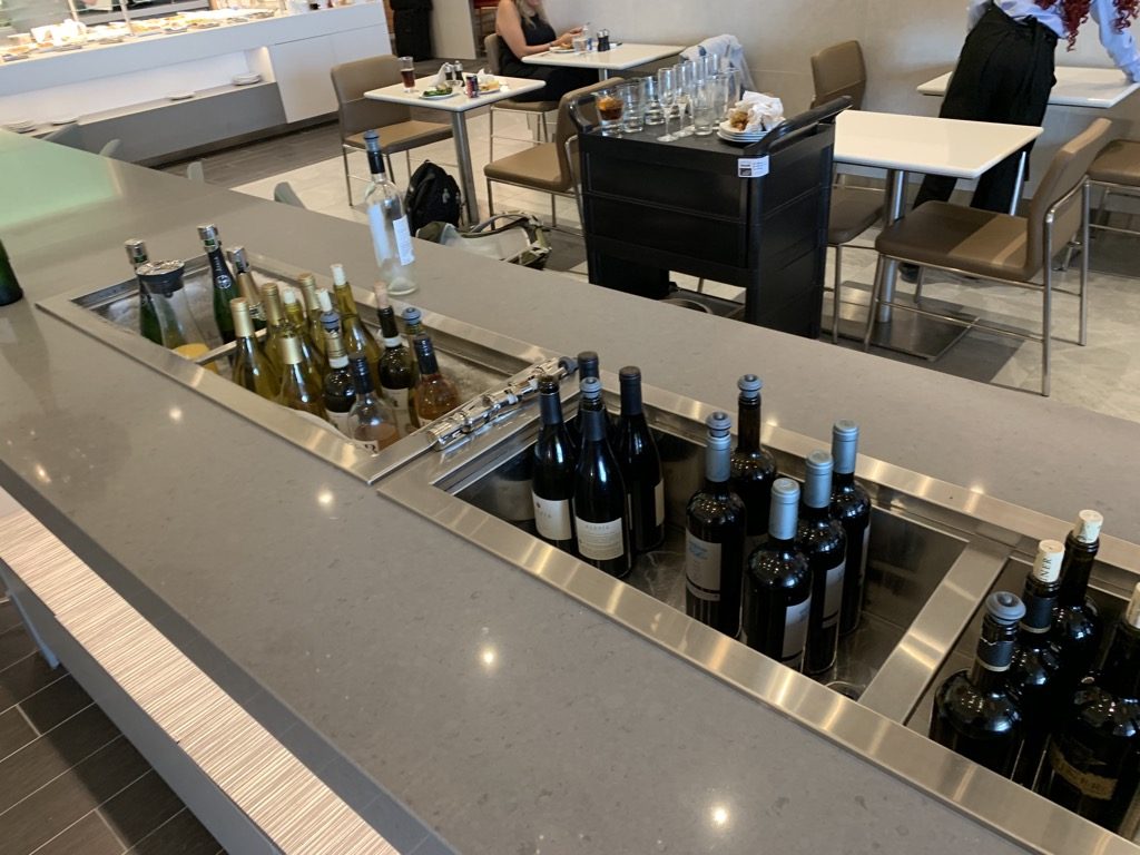 Anders als in vielen US Lounges üblich, gibt es in der Flagship Lounge keine bediente Bar, sondern alle alkoholischen und nichtalkoholischen Getränke stehen offen in der Lounge zur Selbstbedienung. Hierbei kann sich das von American Airlines Gebotene durchaus sehen lassen.
