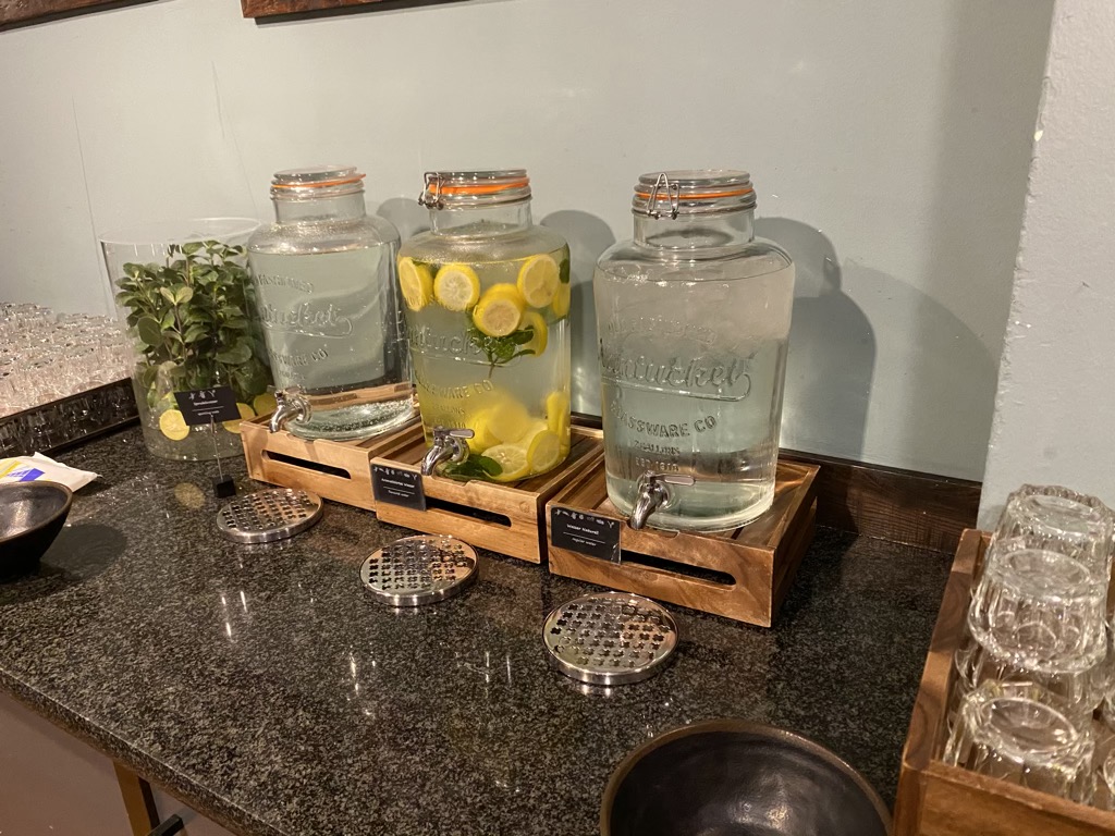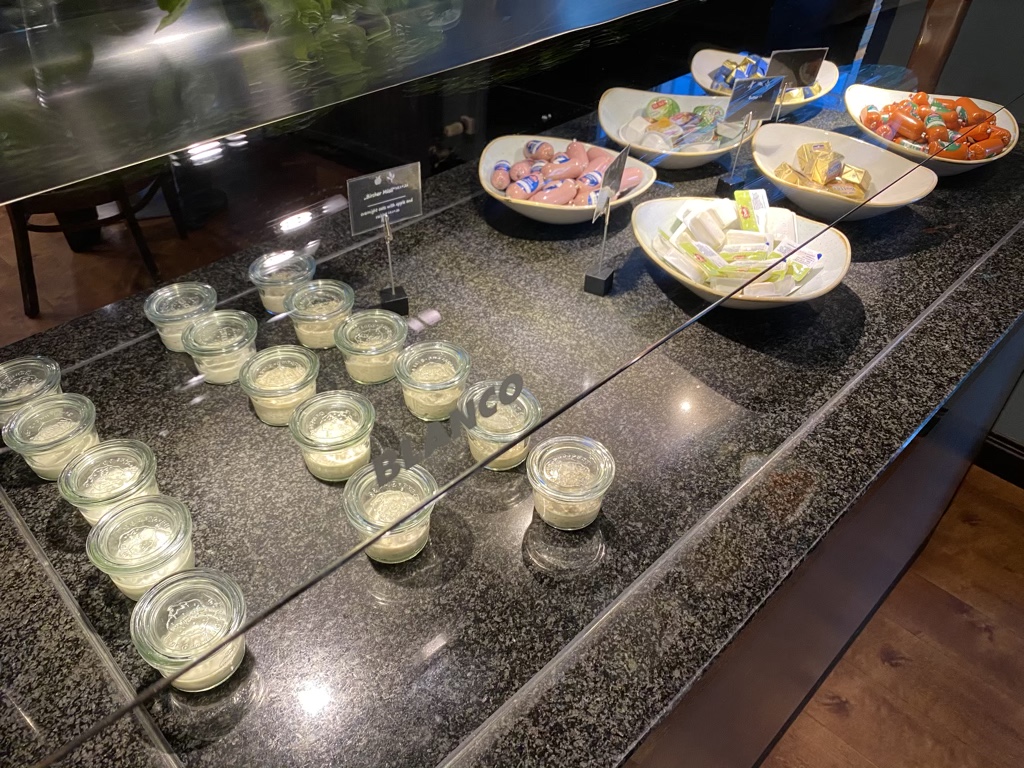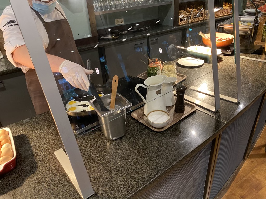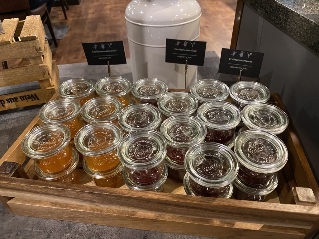 Im Rahmen der Covid-19 Maßnahmen musste man bei Verlassen des Tisches eine Alltagsmaske tragen. An den einzelnen Stationen des Buffets lagen Desinfektionstücher bereit und alle portionierbaren Dinge, wie Marmelade, Müsli etc. wurde in kleinen Gläschen mit Deckel präsentiert.