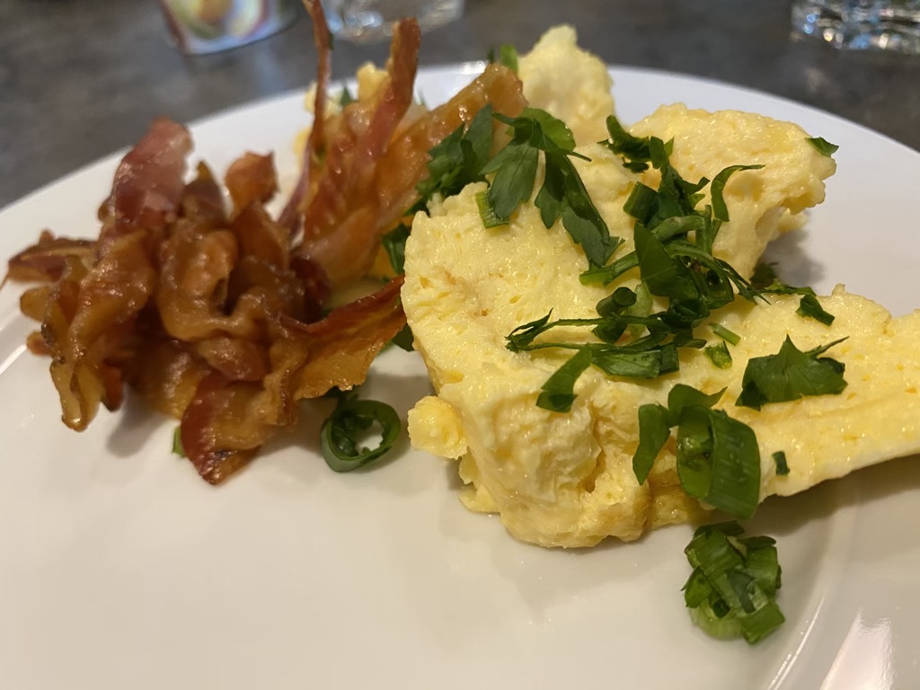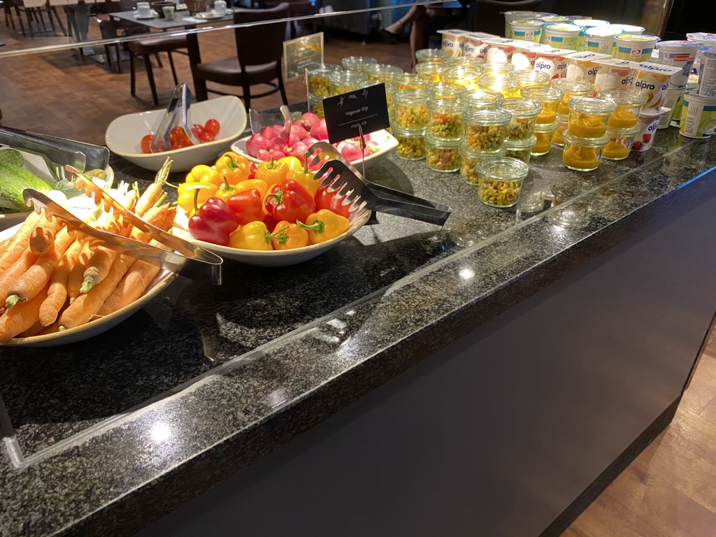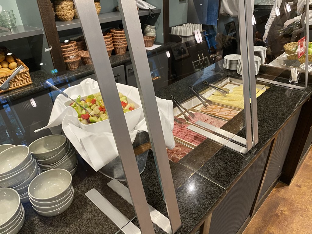 Beim Frühstück wurden die üblichen Dinge wie Backwaren, Aufschnitt, Obstsalat, Marmeladen, Müsli und Joghurt angeboten. Es gab auch Extras, wie vegane Alternativen und eine Station, an der frisches Spiegelei und Rührei angeboten wurde. Ich bestellte mir ein Rührei mit Speck, Käse und Kräutern und bekam leider nur ein warmgehaltenes Standardrührei mit kaltem Speck als Beilage. Schade, wenn man proaktiv frisches Rührei anbietet.