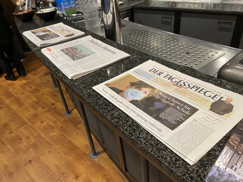 Besonders habe ich mich beim Frühstück darüber gefreut, dass es auch Mineralwasser gab. Es gibt für mich fast nichts Schlimmeres, als nach dem Frühstück durstig zurück zum Zimmer zu gehen. Ebenso hat mich das Angebot an Tageszeitungen überrascht. Dies findet man so nicht in vielen Hotels.
