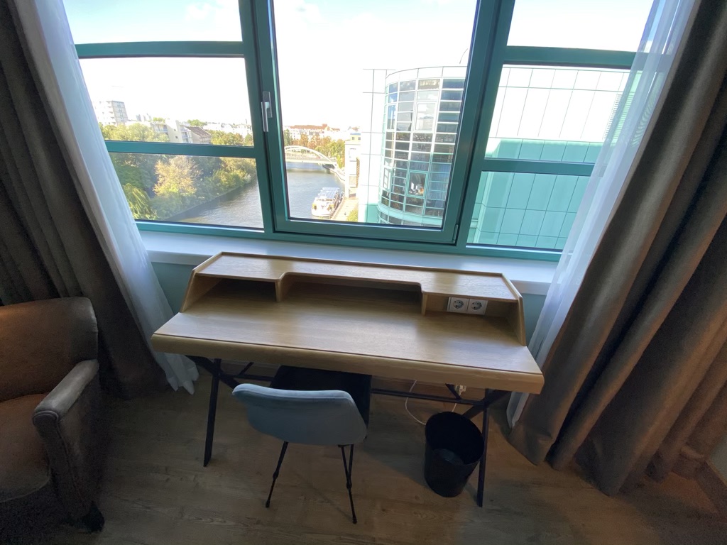 Mein für 93€ (inkl. Frühstück) gebuchtes Standardzimmer war auf der der sechsten Etage und bot einen schönen Blick über die Spree. Es war sehr modern und geschmackvoll eingerichtet, mit tollen Farbakzenten. Auf der rechten Seite hinter der Tür befand sich auf der rechten Seite das Badezimmer, welches mit einer Dusch- Badewanne, einem Waschbecken und WC ausgestattet war. Auf Amenities, außer Seife und einem Vanity Kit, wurde weitestgehend verzichtet.