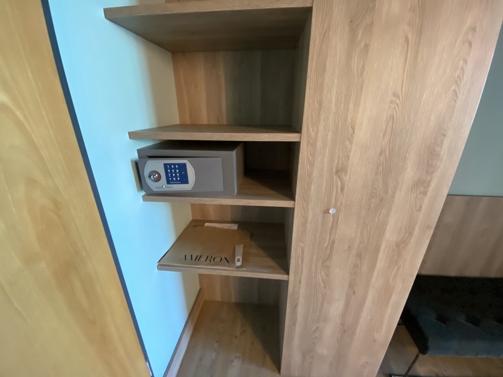 Gegenüber des Badezimmers gab es einen kleinen Schrank, in dem der Safe verbaut war. Daneben stand eine kleine stoffüberzogene Bank, die ich als Kofferablage nutzte.