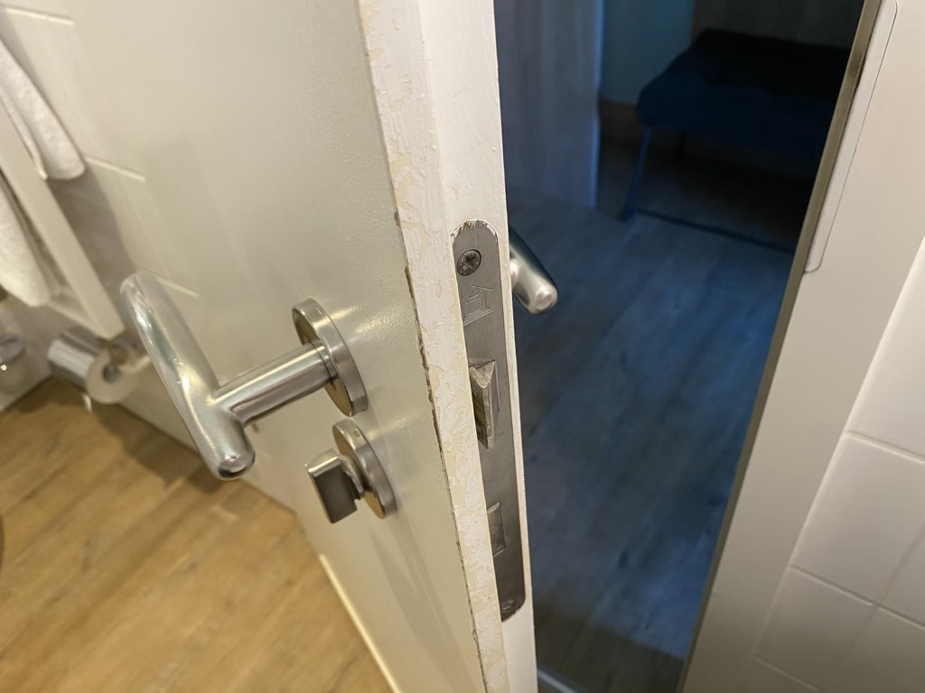 Insgesamt war das Zimmer in einem guten Zustand und sehr sauber. Den guten Eindruck getrübt hat aber leider die Badezimmertür, die extrem unschön und abgenutzt aussah.