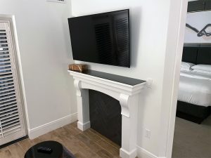 Hinter der Eingangstür ging es zunächst in den Wohnraum. Rechts sofort eine kleine Küchenzeile mit einem hohen Tisch mit Barhockern. Weiter geradeaus war ein Sofa inkl. Sofatisch mit Blick auf einen Fernseher. Der Kamin unter dem Fernseher ist natürlich nur ein Designelement. Neben dem Sofa steht noch ein Sessel mit Blick zum Fenster.