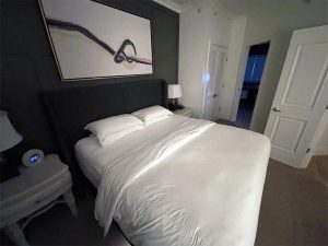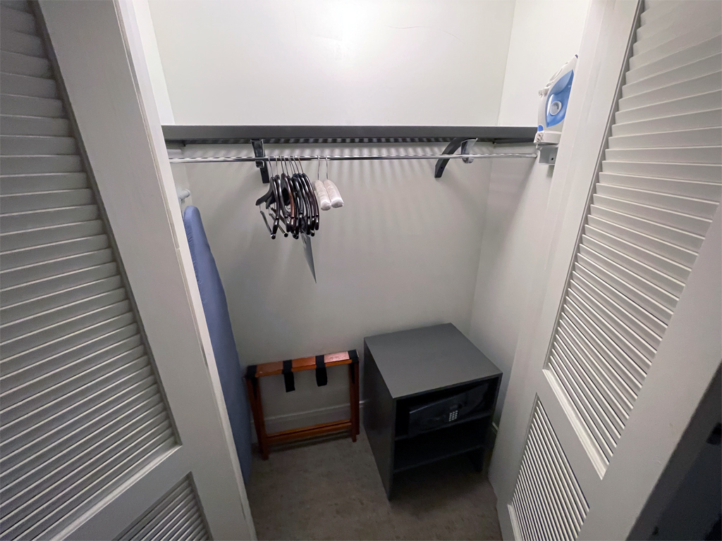 Ein Durchgang verbindet den Wohnraum mit dem Schlafzimmer. Hier gab es eine Kommode und das King Size Bett mit Nachttischen. In einer Ecke steht noch ein Sessel und einen Kleiderschrank gibt es natürlich auch. Darin befinden sich ein Bügelbrett, ein Bügeleisen, eine Kofferablage und ein Safe. Natürlich neben einer Kleiderstange und vielen Kleiderbügeln.