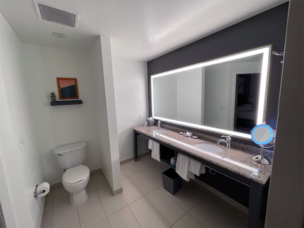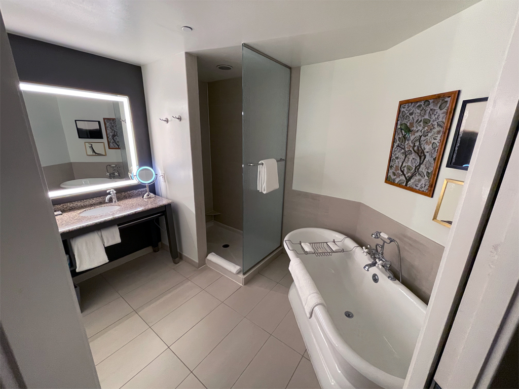Das Badezimmer ist ein Nebenraum des Schlafzimmers. Highlight ist eine freistehende Badewanne. Die fast ebenerdige Dusche in der Ecke gut versteckt und der Waschtisch überzeugt mit einem Handtuchhalter. Warum so viele Hotel keine Handtuchalter/-haken in der Nähe von Waschbecken haben, werde ich wohl nie verstehen. Überraschend ist, dass der Waschtisch trotz seiner Länge kein zweites Waschbecken aufweist.