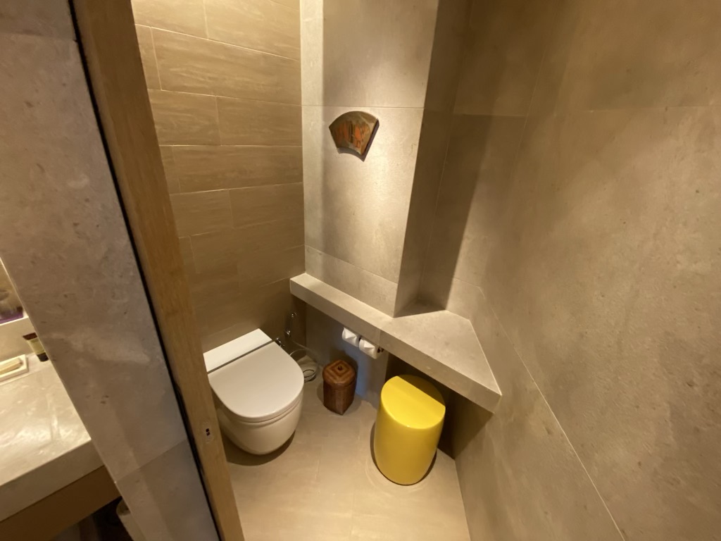 Die Ankleide bot für mich genügen Platz und ein Highlight: die vom Hotel lustig bedruckten Badelatschen. Ebenso bot das Bad genügend Platz und gliederte sich in die Dusche auf der linken Seite und die abgetrennte Toilette auf der rechten Seite. In der Mitte befand sich das große Waschbecken mit reichlich Ablagefläche und allen möglichen Amenities.