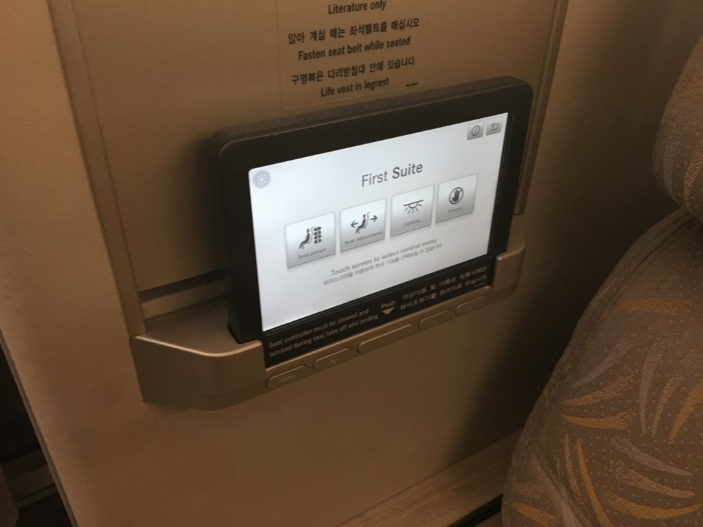 Die Asiana First Class Suiten im Airbus A380 lassen sich am besten als „wuchtig“ bezeichnen und bieten sehr viel Platz. Jeder Sitz verfügt auch über einen Ottomanen oder „Buddyseat“, samt Sicherheitsgurt, auf welchem eine zweite Person Platz nehmen kann um z.B. zusammen zu essen. Allerdings müssen hierfür beide Passagiere, wie bei jeder Airline, in der First Class reisen.