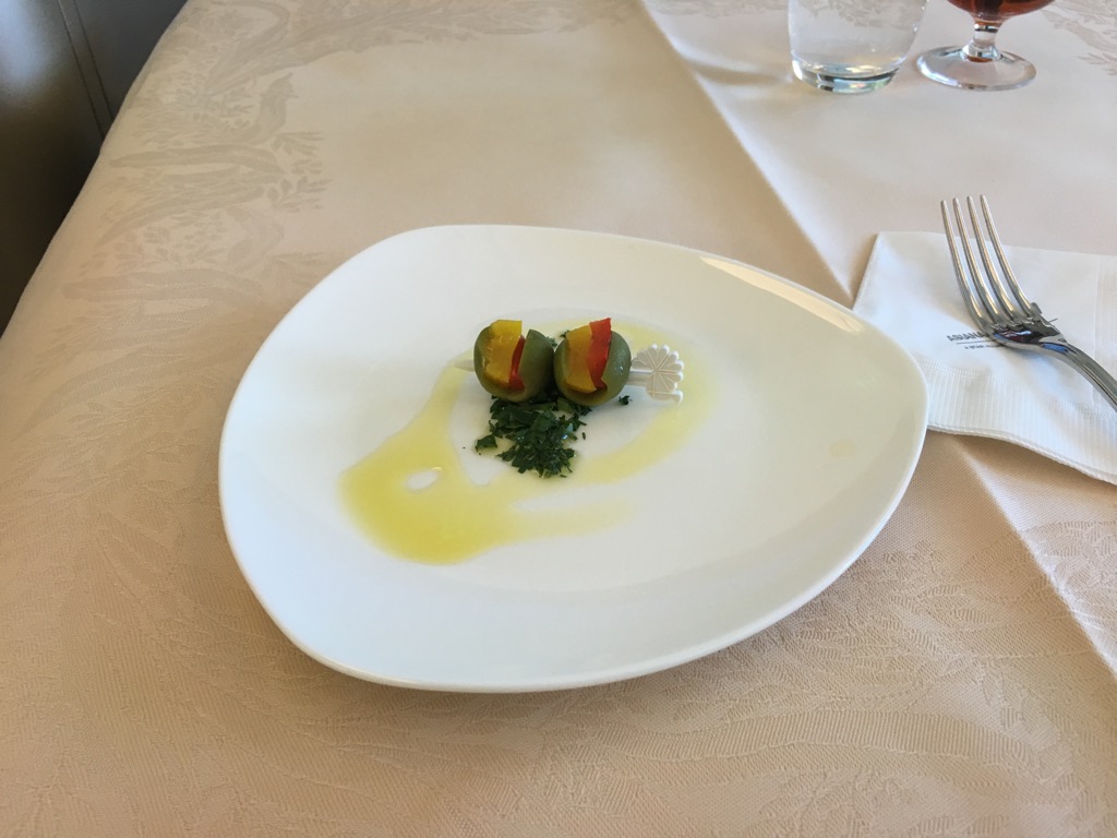 Auch ein kleiner Gruß aus der Küche wurde von der Kabinenchefin serviert. Die zwei gefüllten Oliven wirkten auf dem großen Teller allerdings ein wenig verloren.