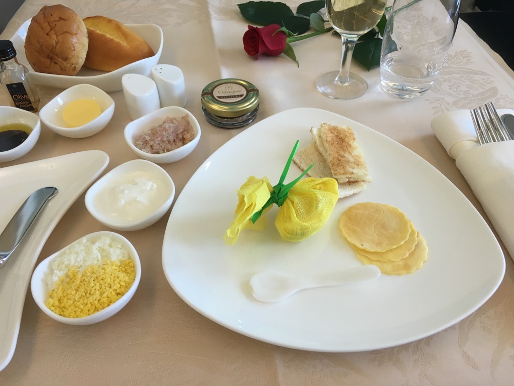 Asiana bietet auch einen Kaviar Service in der First Class an. Besonders die Präsentation ist hier fantastisch. Ganz klassisch wird mit einem Perlmuttlöffel serviert.